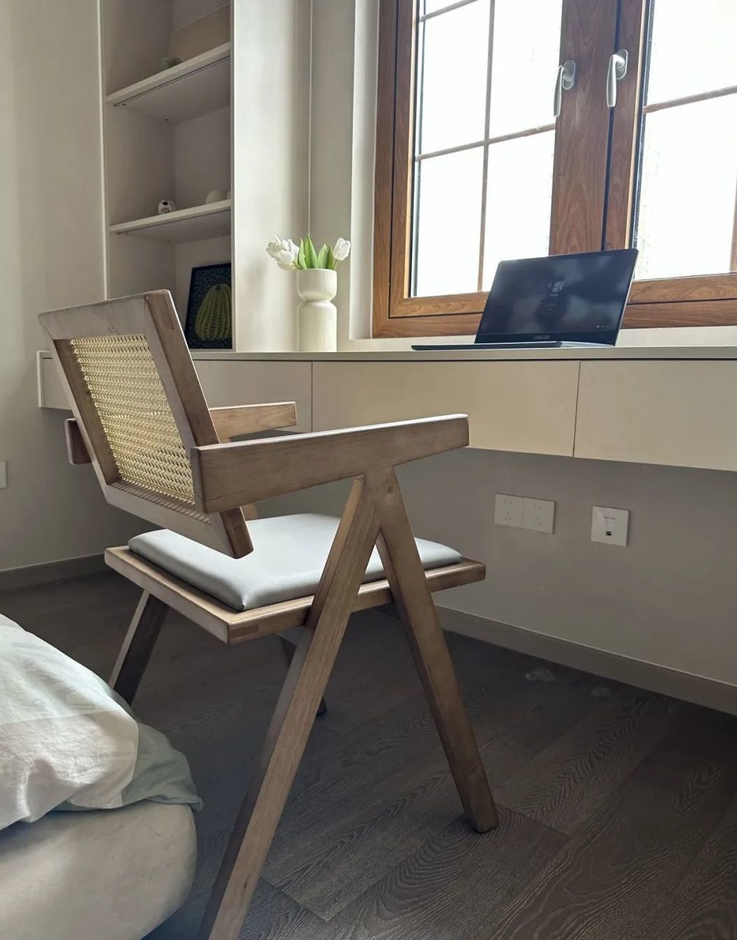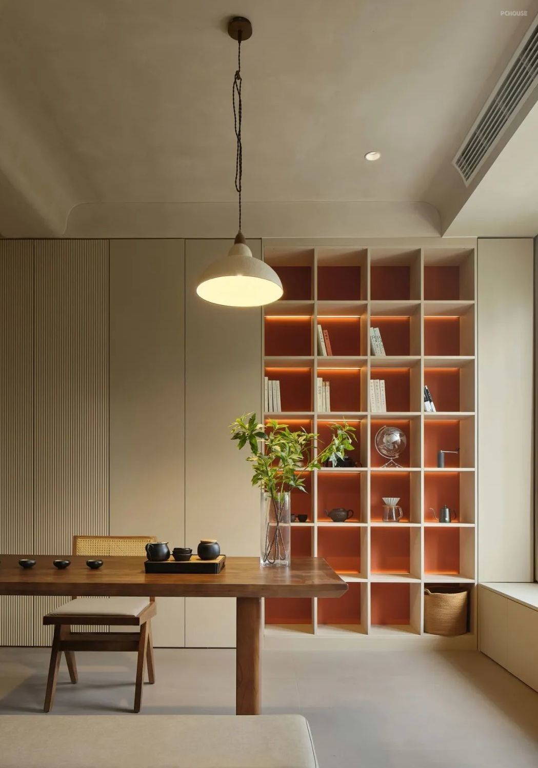 在选材细节上,我们选用的是实木多层的柜体材质,颜色也只有做成烤漆色,才可以和整个空间色调一致。餐椅是精心挑选的藤编椅,复合高颜值的侘寂美学。