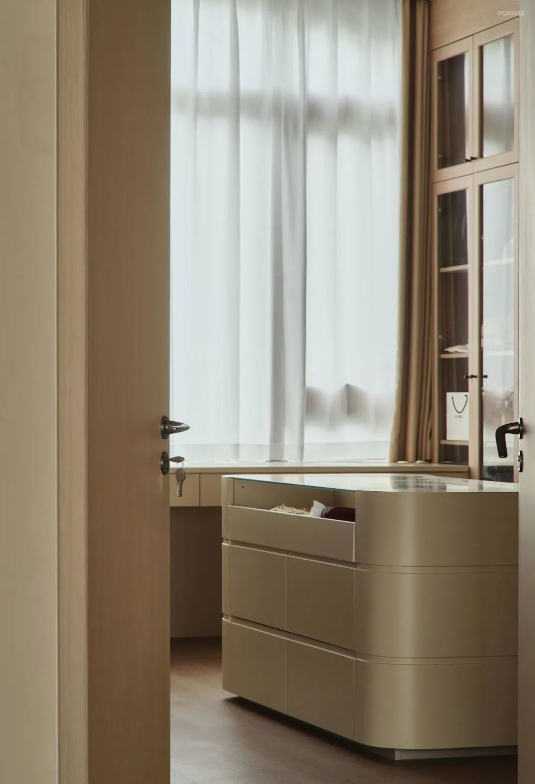 在客厅的一侧,有两面巨大的落地窗,它们为室内引入了大量的自然光线。窗外的景色在光线的照射下透过窗户流动,与室内的奶咖色相互辉映。窗边是一整组柜子,可以作为收纳使用,同时也暗藏了我们的冰箱,和零食柜,让整个客厅空间更显整洁。