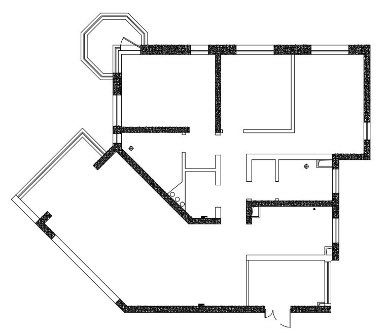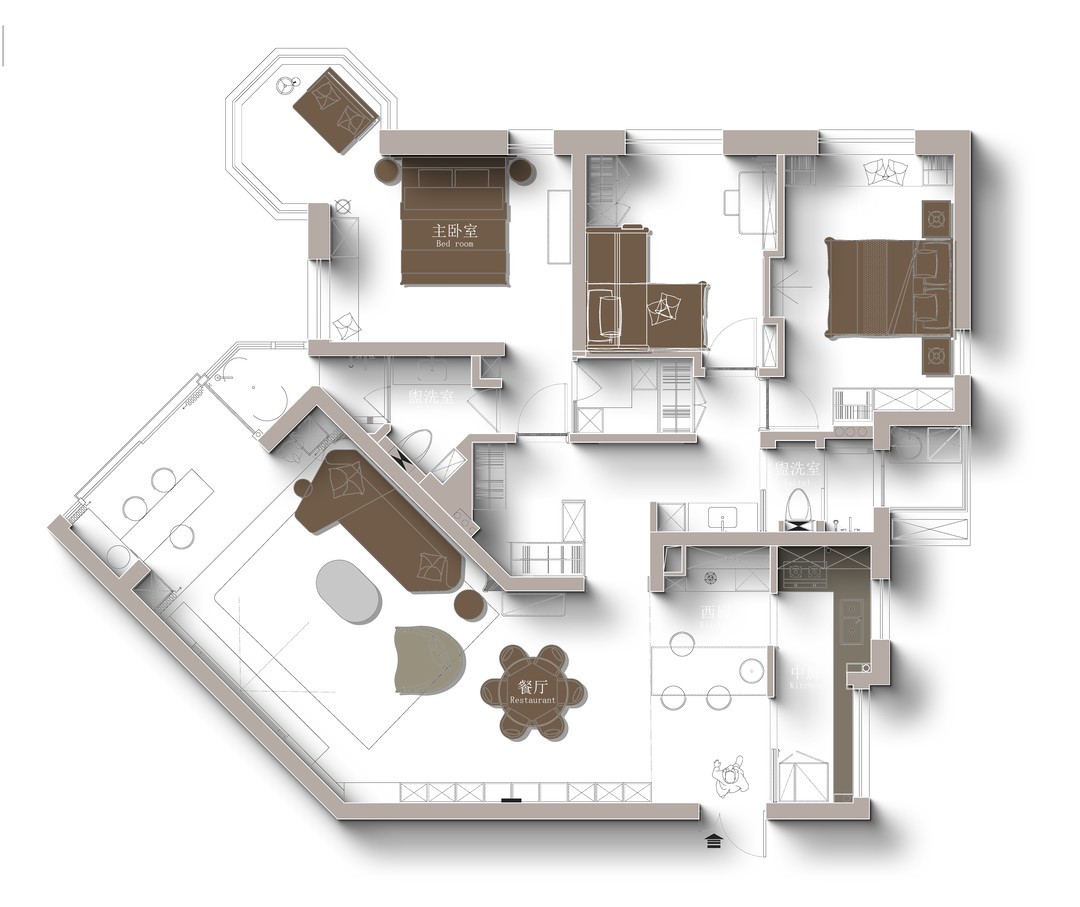 原户型的缺陷也就巧妙地转化成房屋的转折点,在整个公区,转角将成为融合的中心。