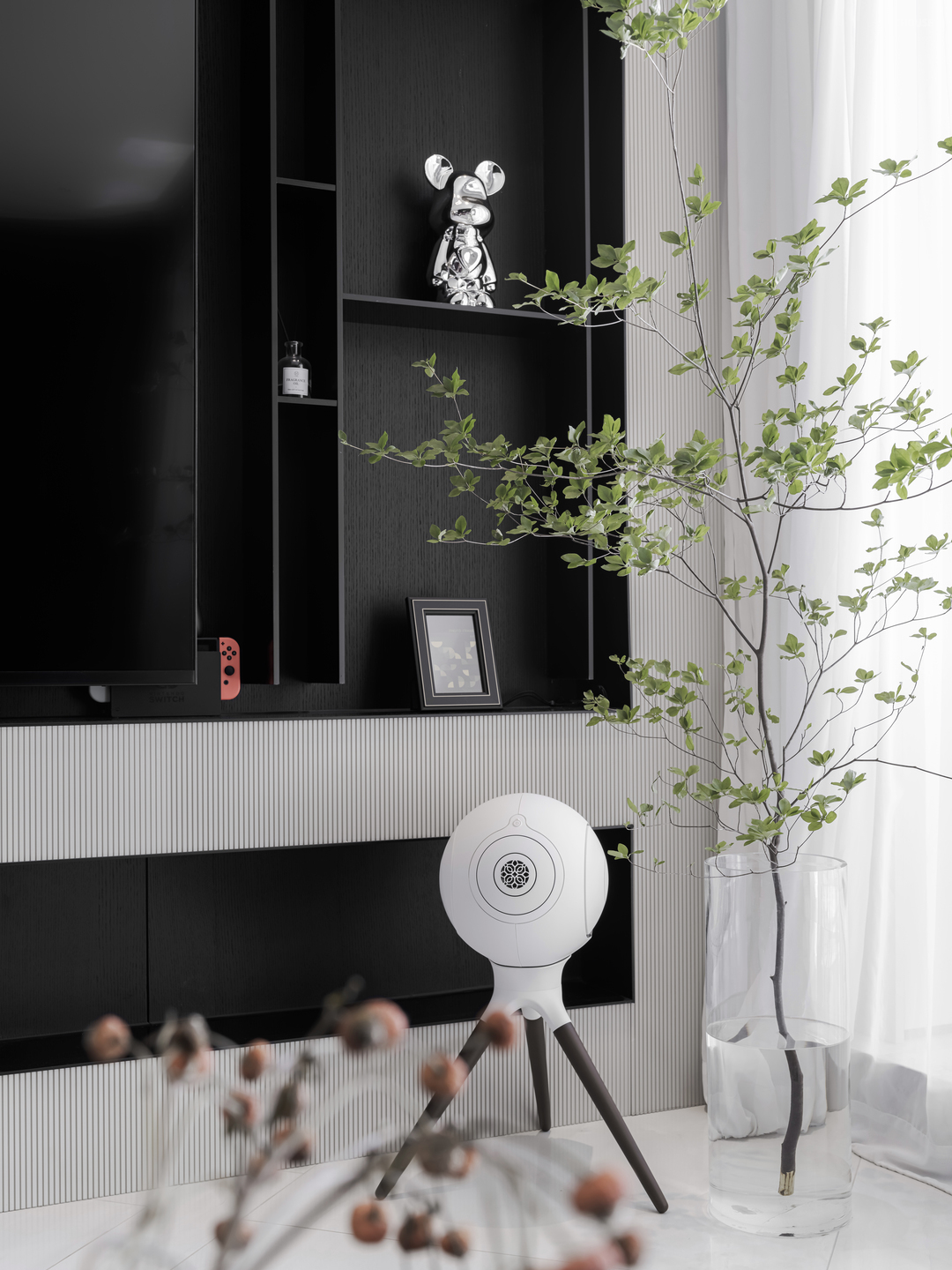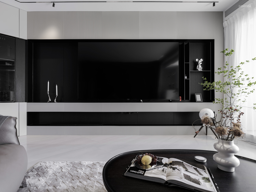 客厅电视柜以及整面收纳柜。整体视觉干净利落,黑与白极致搭配,兼具沉稳和时尚感,任由居者放空思绪和想象的空间。