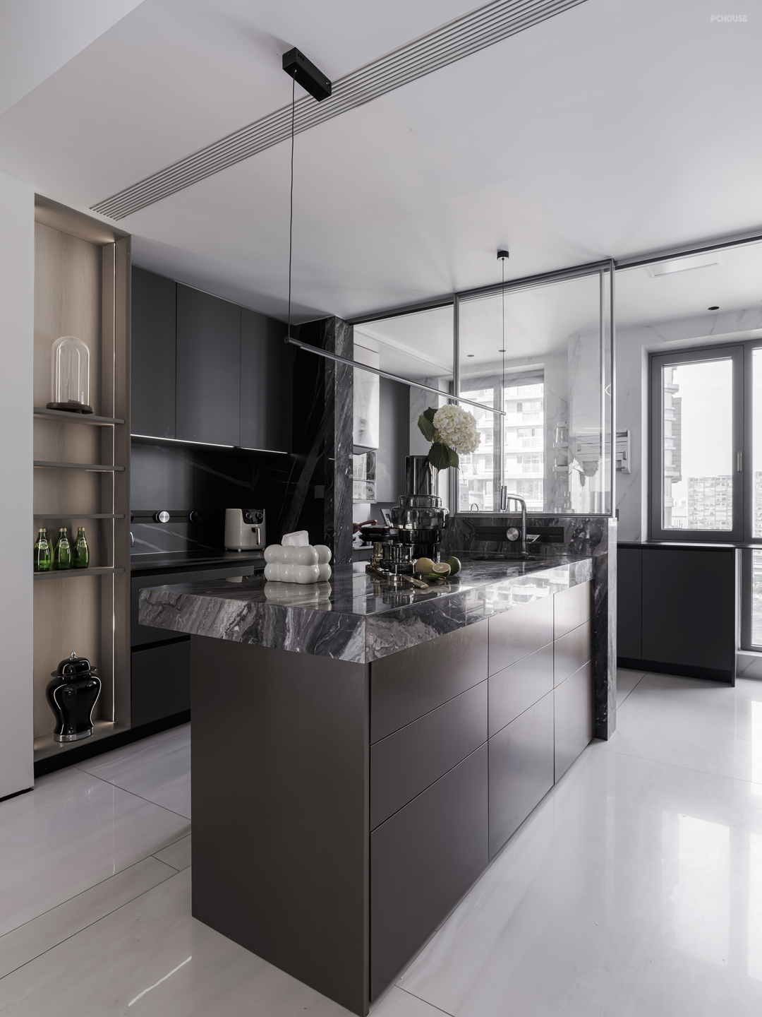 入户右手依次是西厨中厨,满足不同的烹饪需求。中岛台一体设计,不仅能提供足够多的储藏空间。