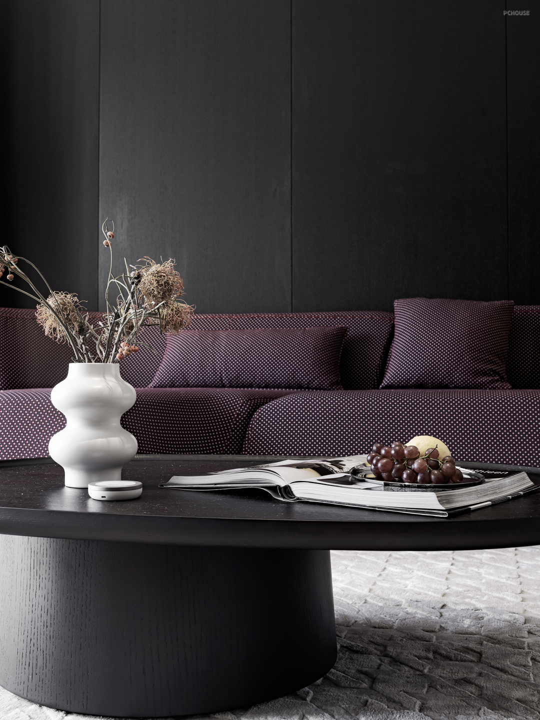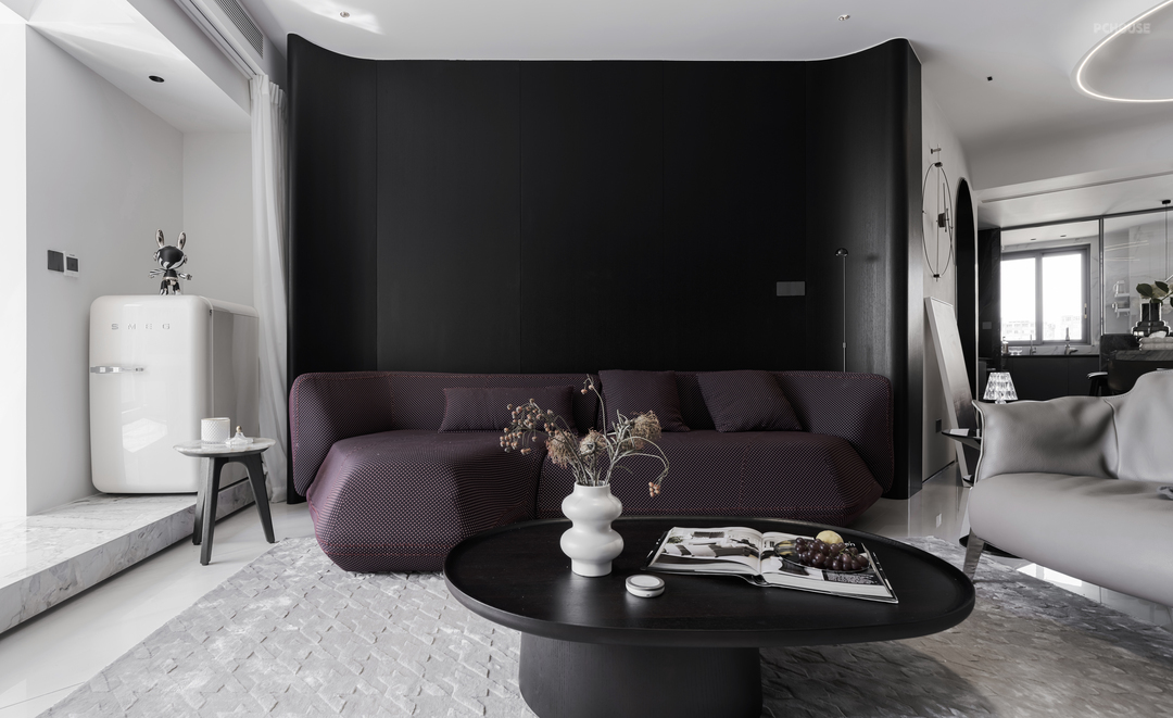 在黑白里温柔地爱彩色,在彩色里朝圣黑白。沙发一隅以深邃的黑色为背景墙,紫红构勒轮廓,一种莫名的魔力邀请你入座。