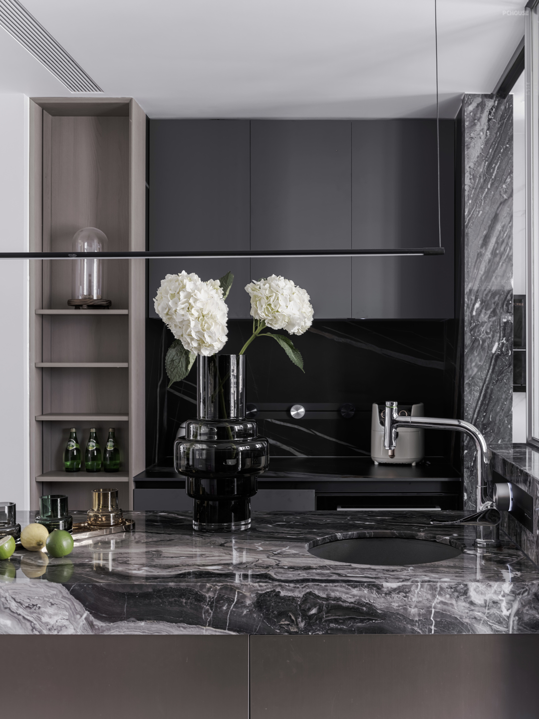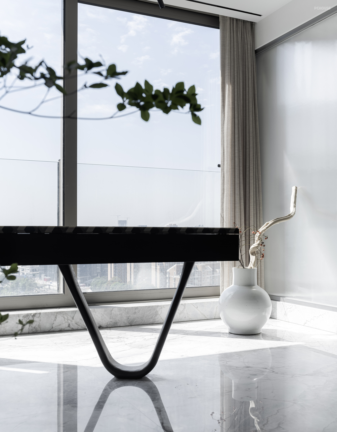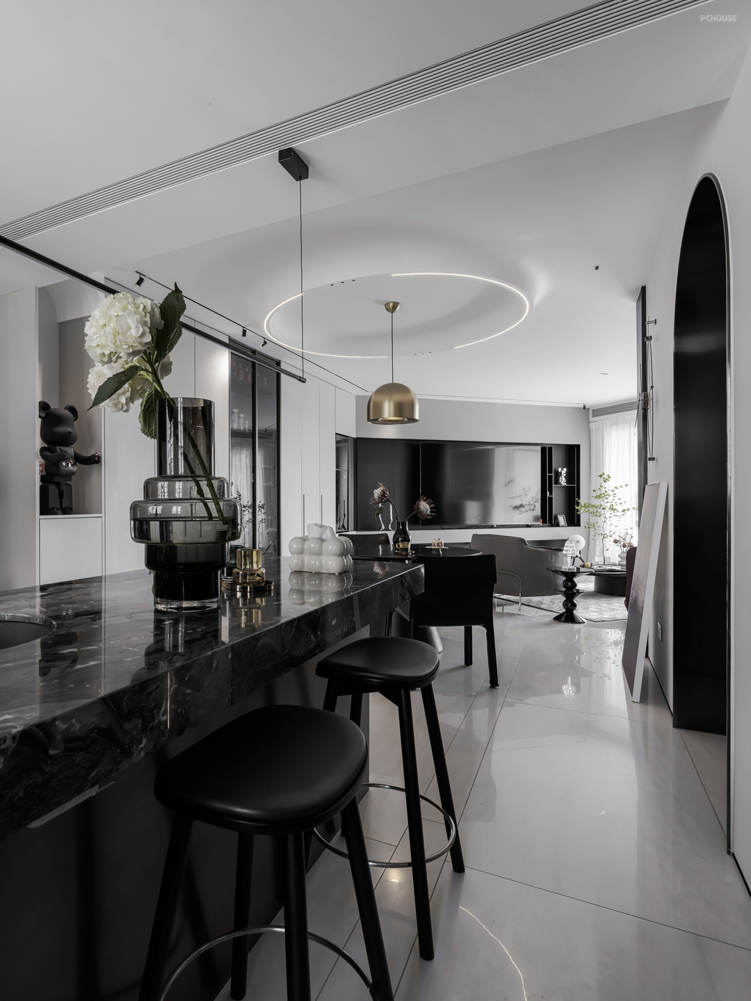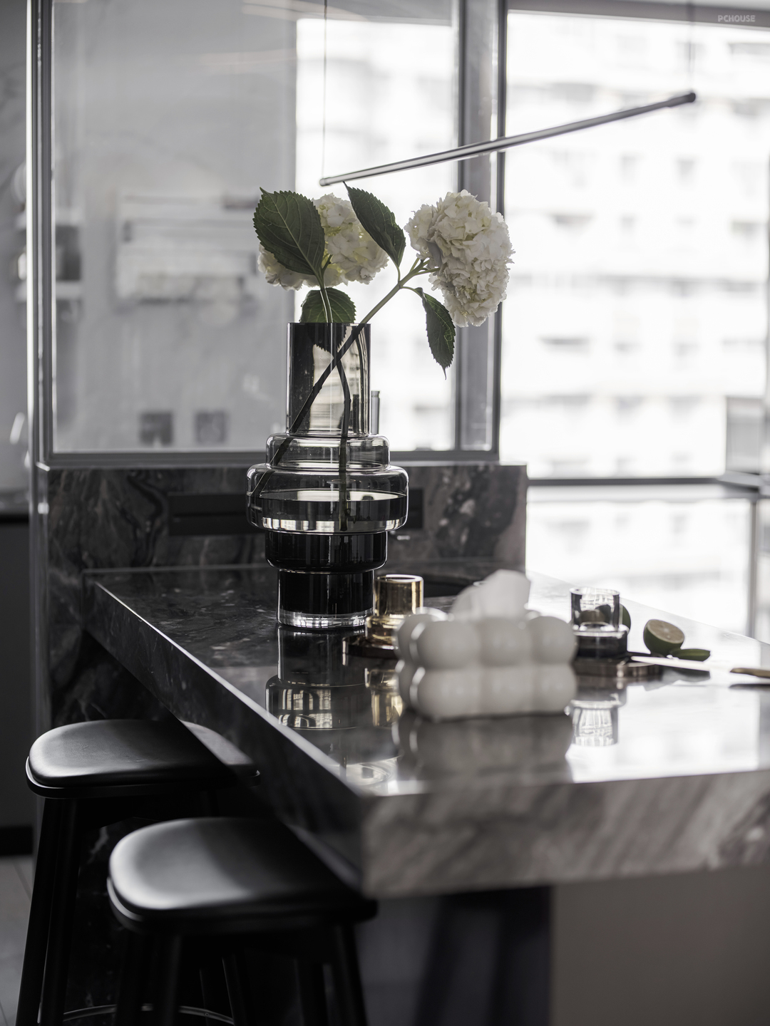 空间不做多余的装饰,简约流畅的线条结合黑白分明的色块勾勒出极简的调性,同时借由不同材质间质感和肌理传递温润感。
