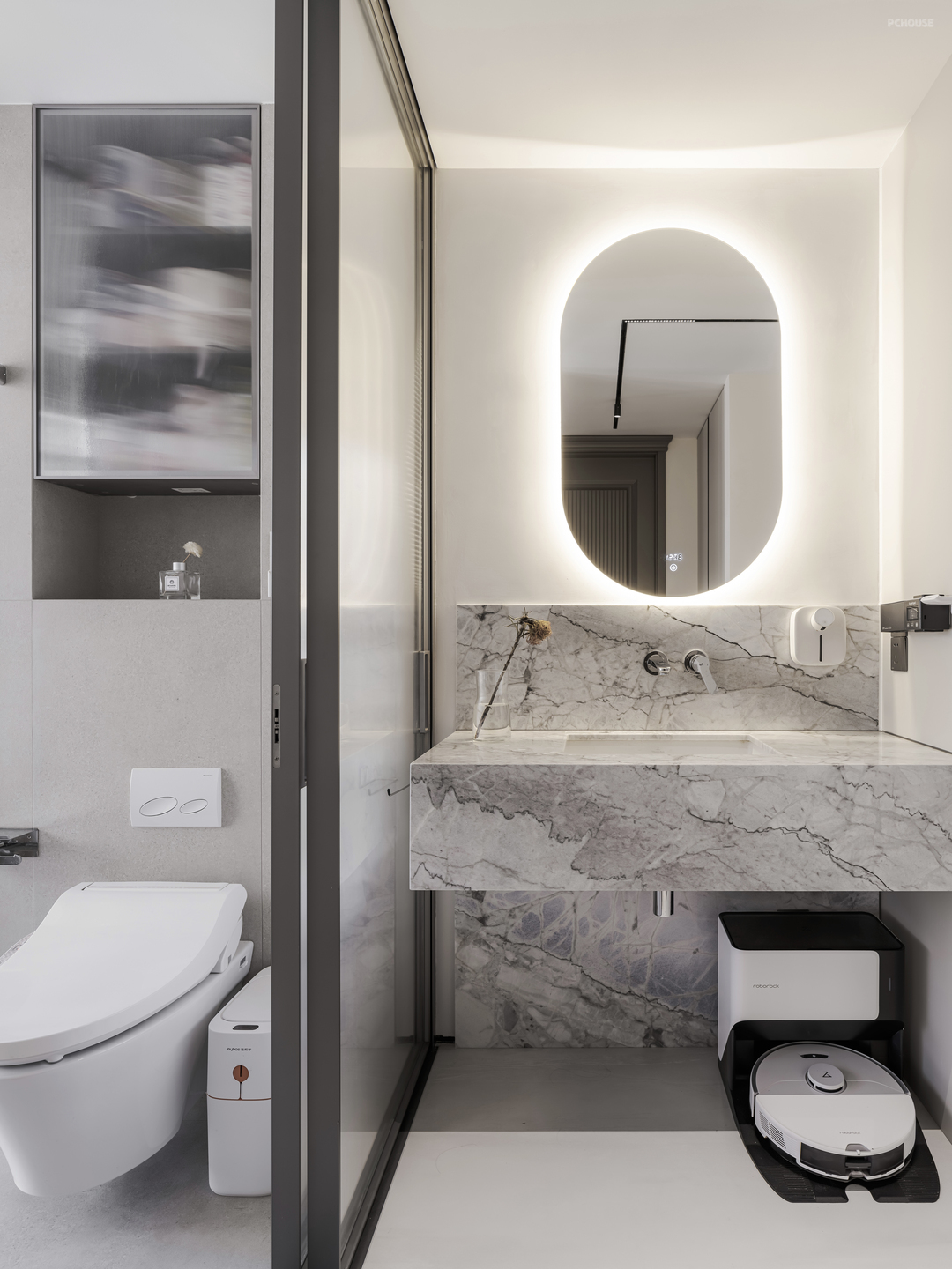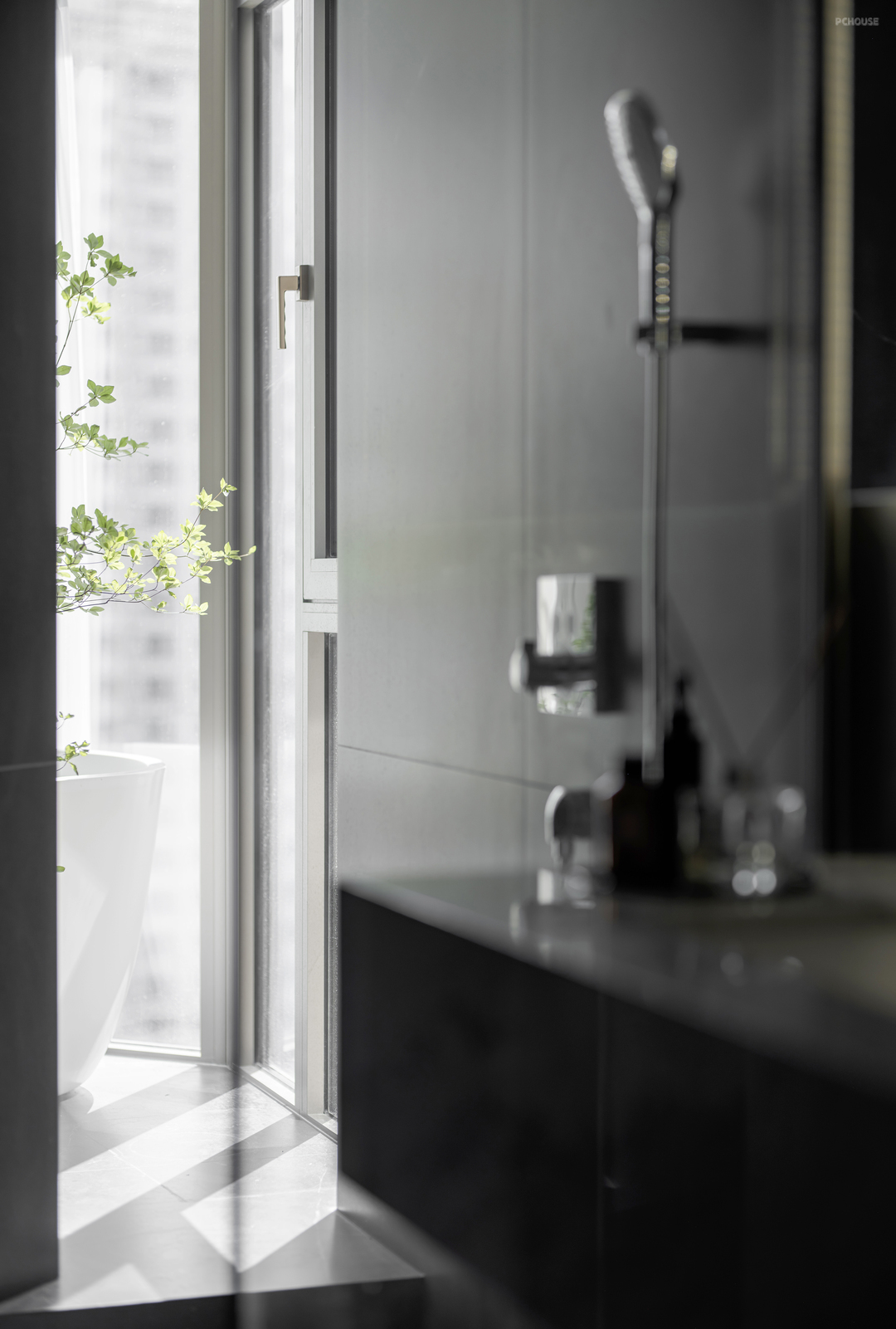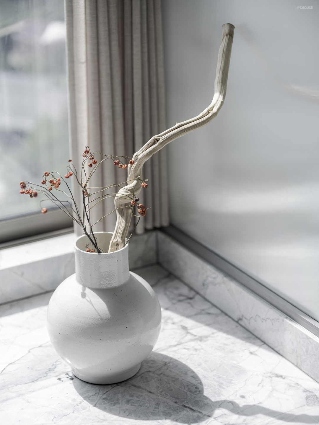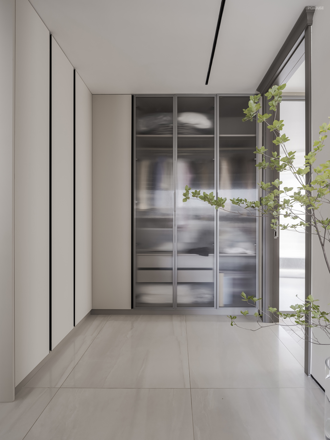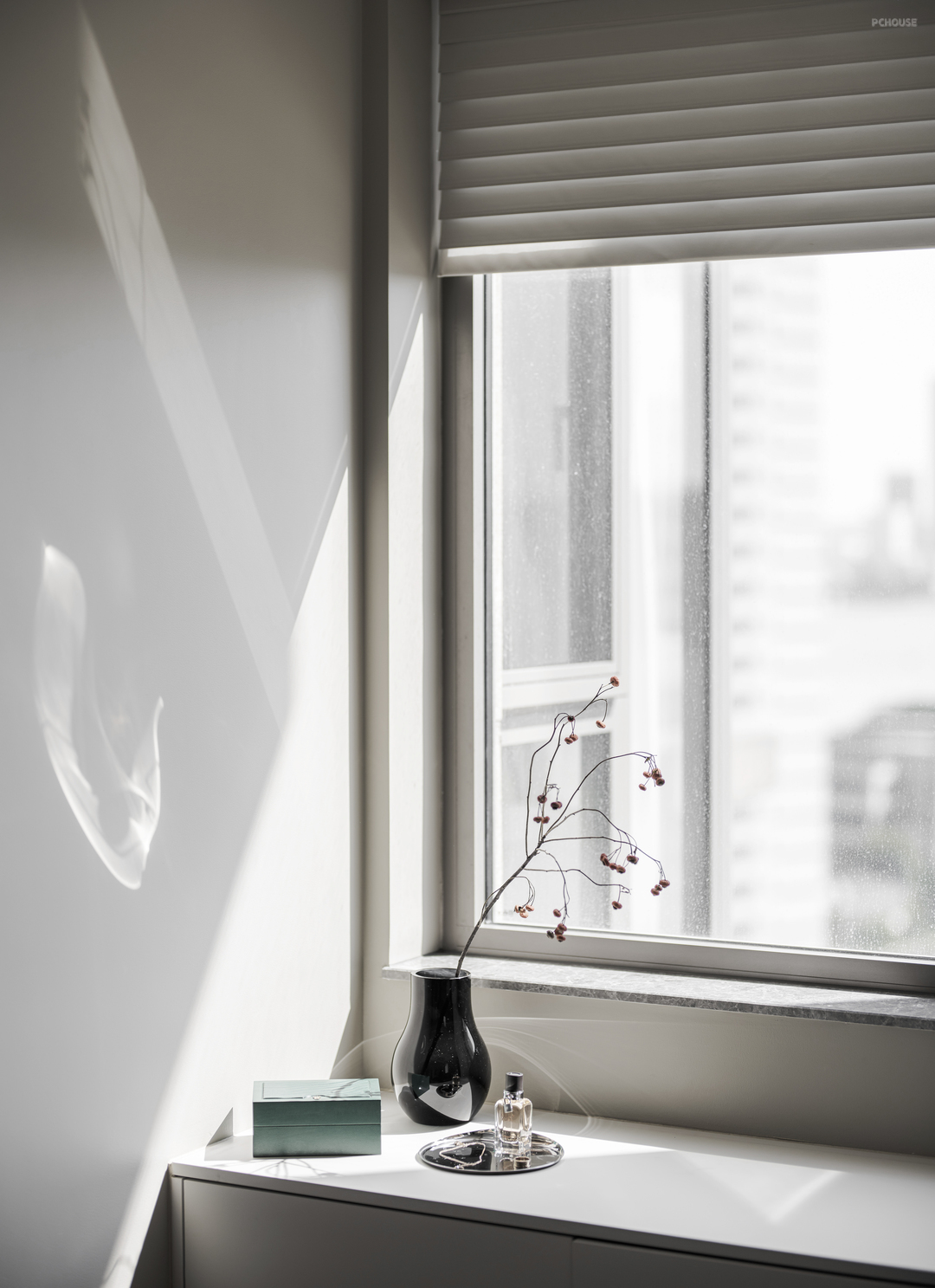 空间不做多余的装饰,简约流畅的线条结合黑白分明的色块勾勒出极简的调性,同时借由不同材质间质感和肌理传递温润感。