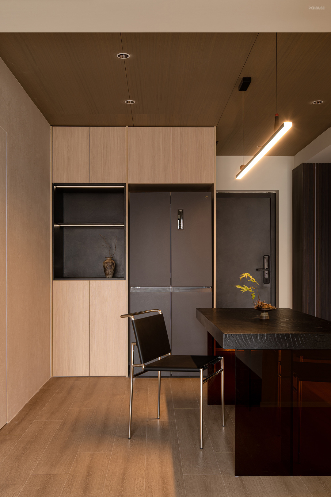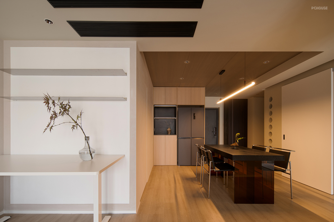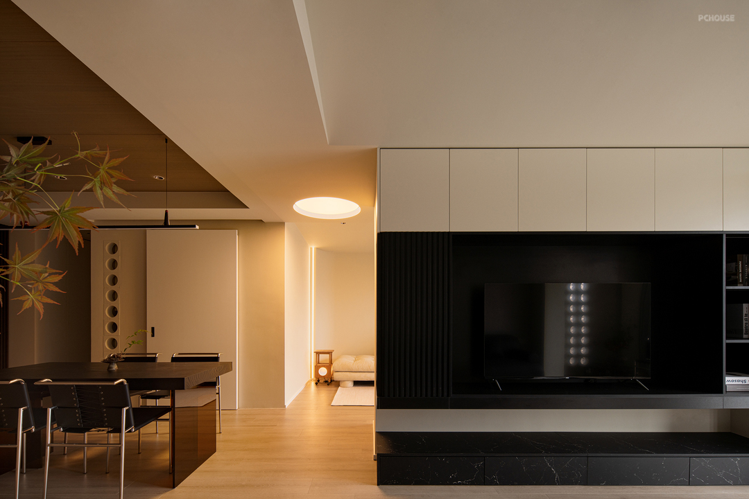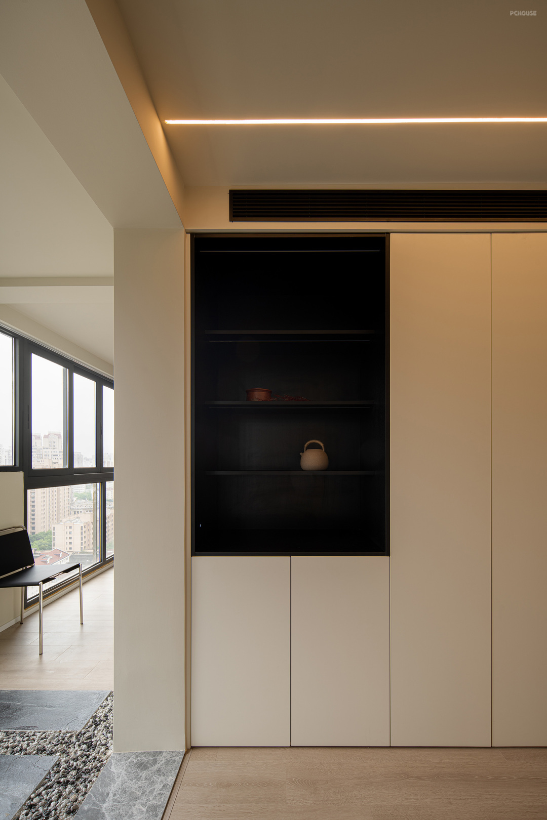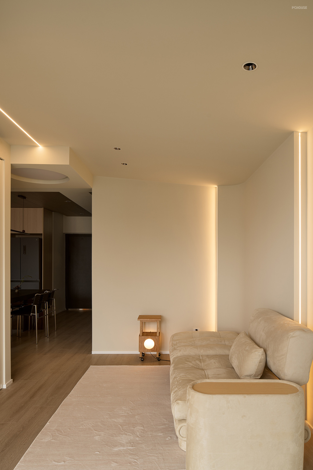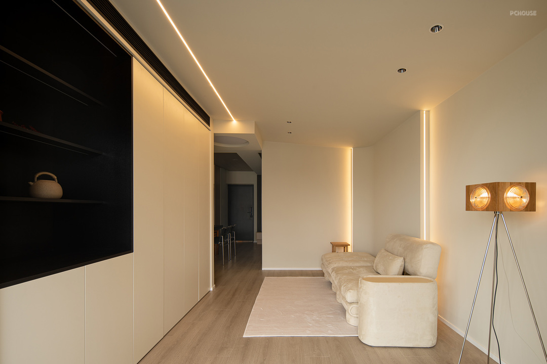 屋主偏爱简约生活,在这适中的空间里,我们更注重释放每个独立空间的立面,减少对背景墙的依赖,将每个空间的立面细腻地拆解并重新组合,使之融为一个和谐的整体,而非孤立的存在。