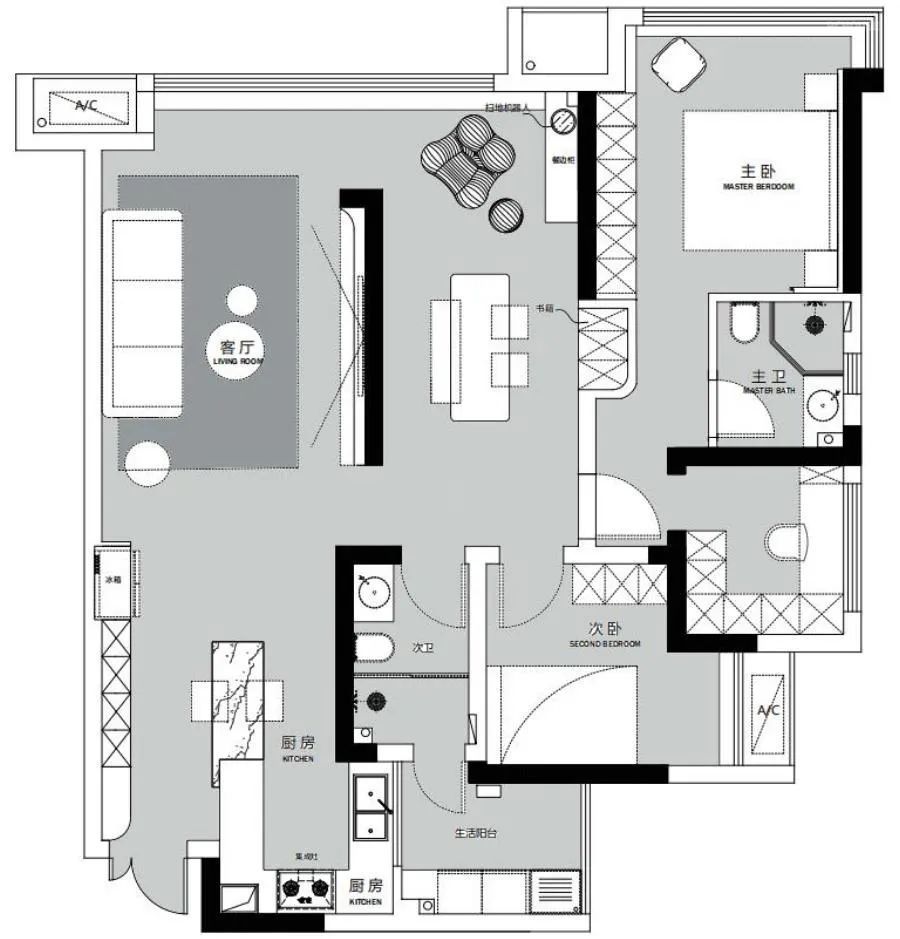 2.生活阳台需要和次卫连通,这样卫生间可以直接走到生活阳台外面,保证了两个空间连通性的同时,使用空间也变得更大。