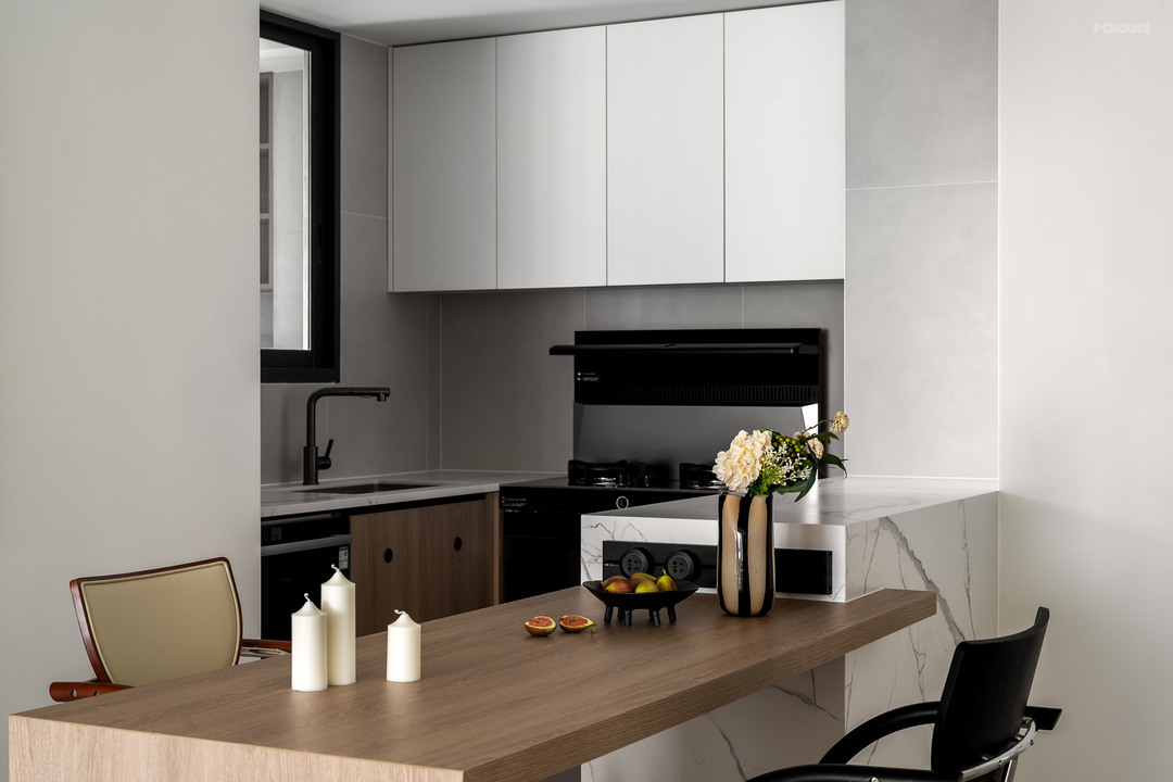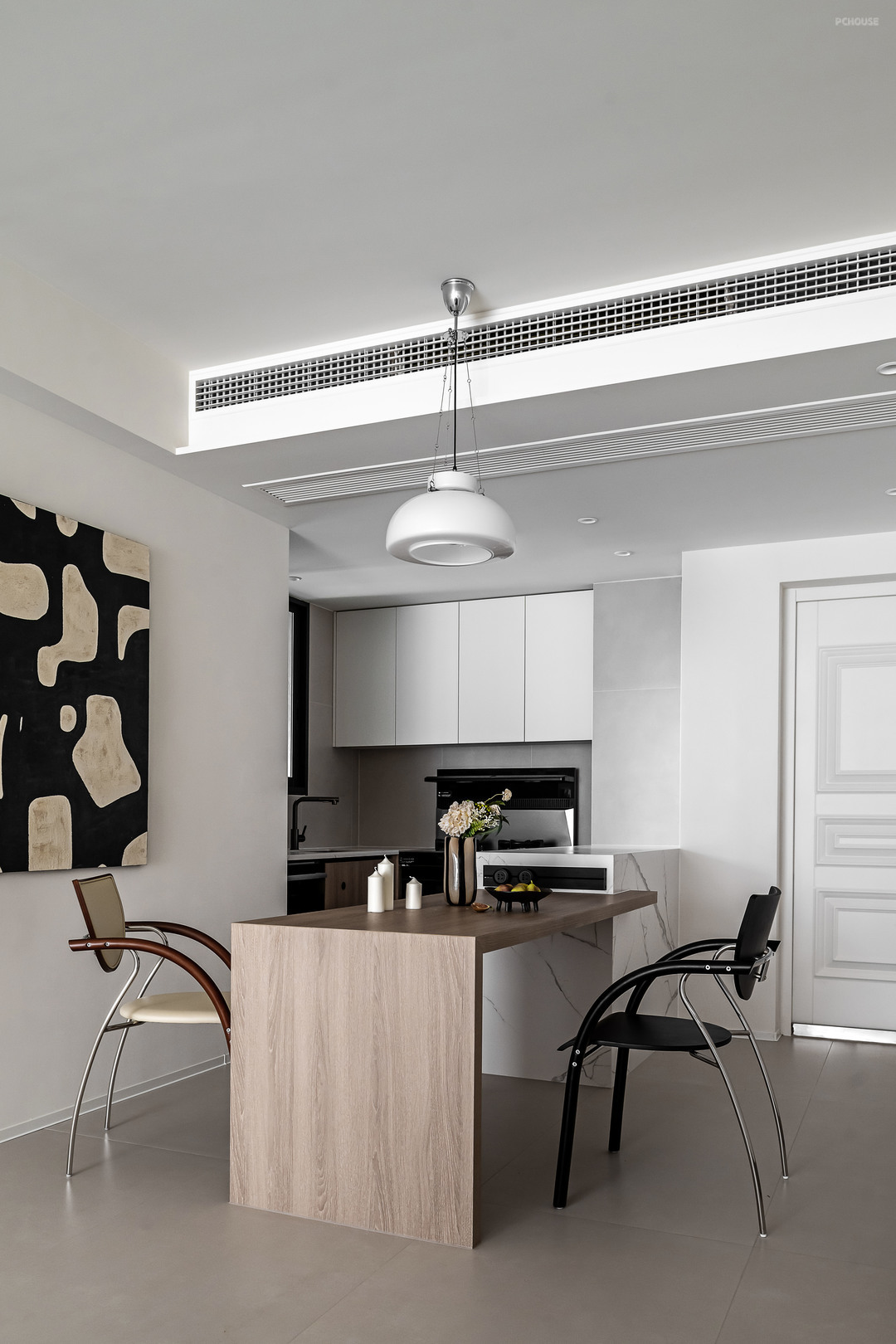 1.已经确认过业主家里是可以做开放式厨房的。开放式厨房不仅让煮饭、炒菜正常运作,还能增加整个空间的采光。客餐厅链接为一体,空间的奶油通透感逐渐浮现~