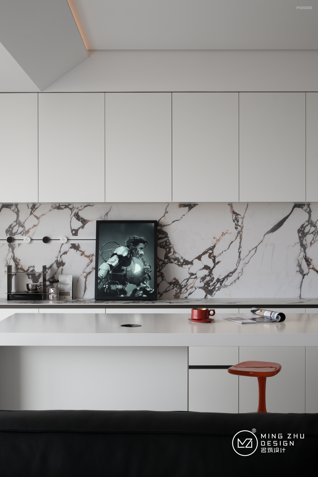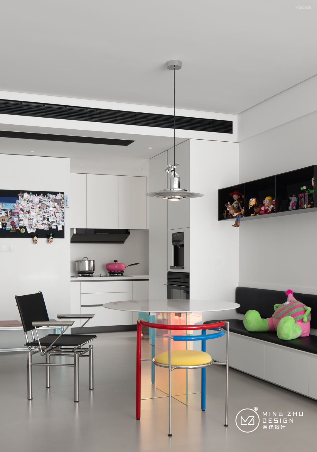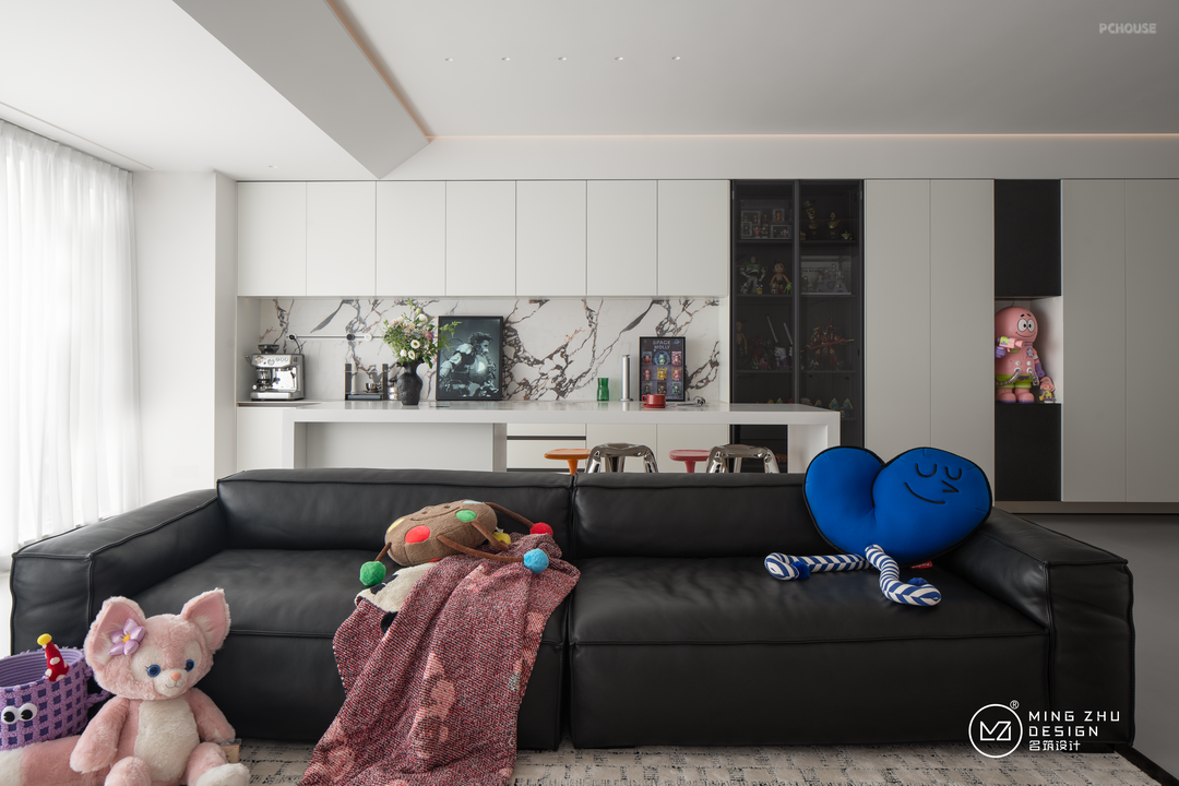 餐厅卡座的设计,为厨房动线腾出了空间,也丰富了餐厅的储物。金属、石材、亚克力不同材质,不同色彩的软装物件,为餐厅也营造了活力。动漫手办充斥在家的不同角落,让屋主的爱好融入在整个家中。