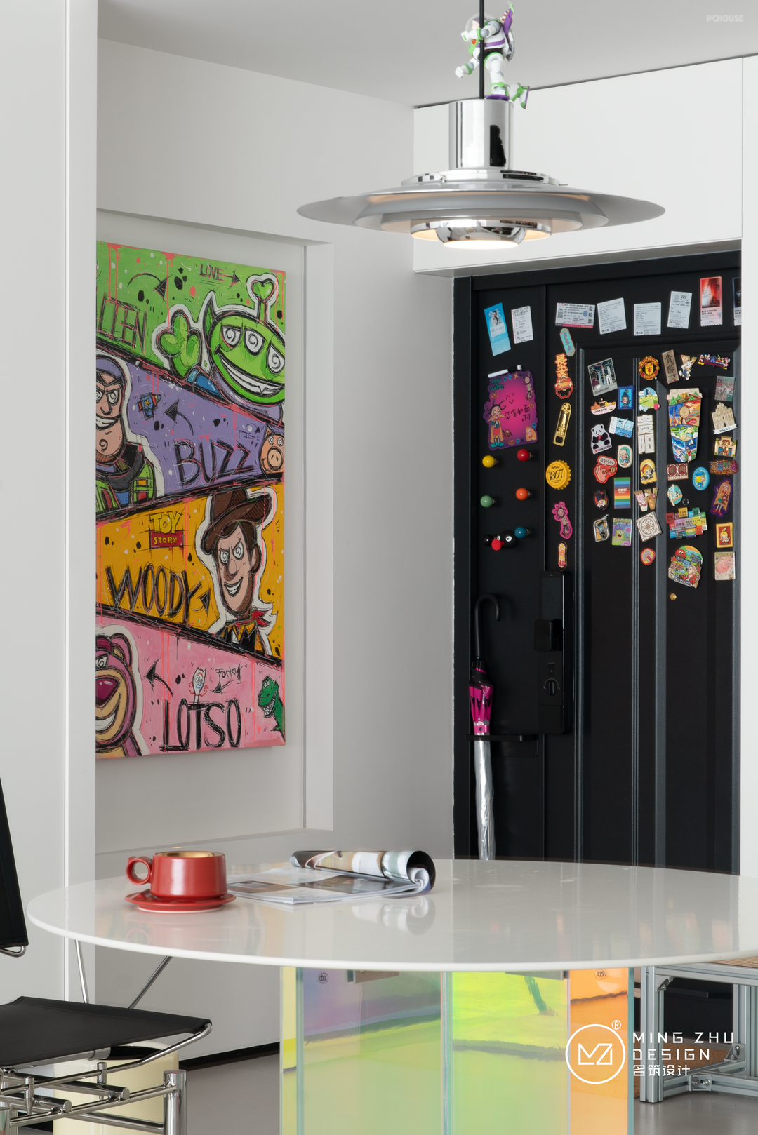 磁吸入户门,小挂架,可以将屋主雨伞、常用拖鞋,以及作为照片墙使用,非常巧妙的收纳了物品。也让呆板的入户门增添了趣味性。右侧墙上充满多巴胺色彩的动漫装饰画,也是屋主喜爱的元素,也迎合了整个空间的调性。