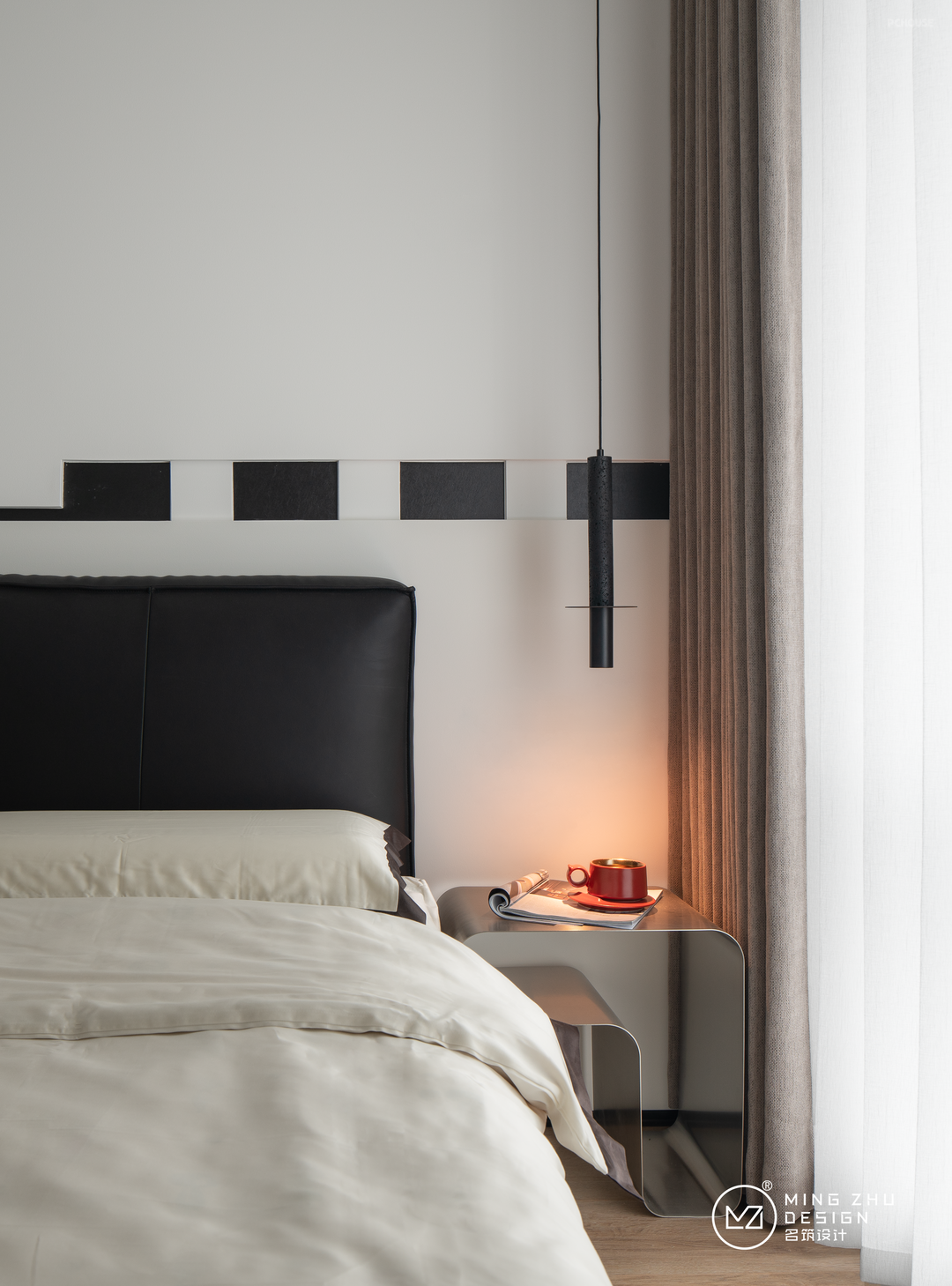 衣帽间位置往主卧休息区看,右边是悬浮梳妆台及储物柜,简约的黑白配色,免拉手设计,看起来干净纯粹。左边大床配色与床头柜背景墙呼应,整体配色统一,延伸感强。金属感的床头柜,增加床头角落的质感。