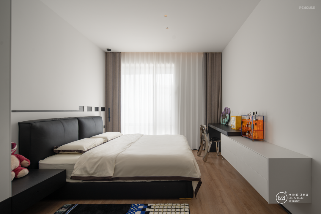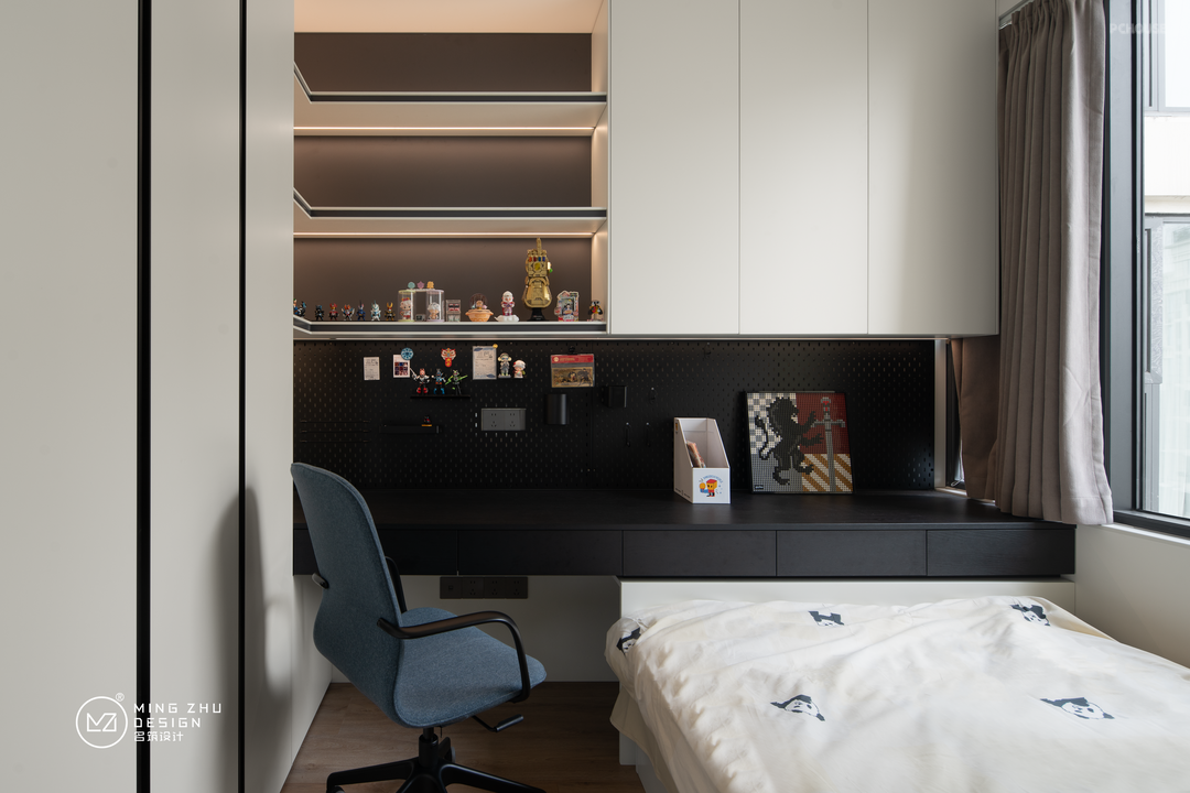 儿童房设计,满足收纳学习。书桌与床一体化设计,增加了使用功能。儿童房的采光是很重要的,在床边原始采光外,开放书柜格板我们也增加了光源,让小朋友学习更护眼。开放书柜方便拿取常用书籍。书桌墙上的洞洞板,可以让小朋友的物件更灵活的放置,让桌面保持整洁有序。