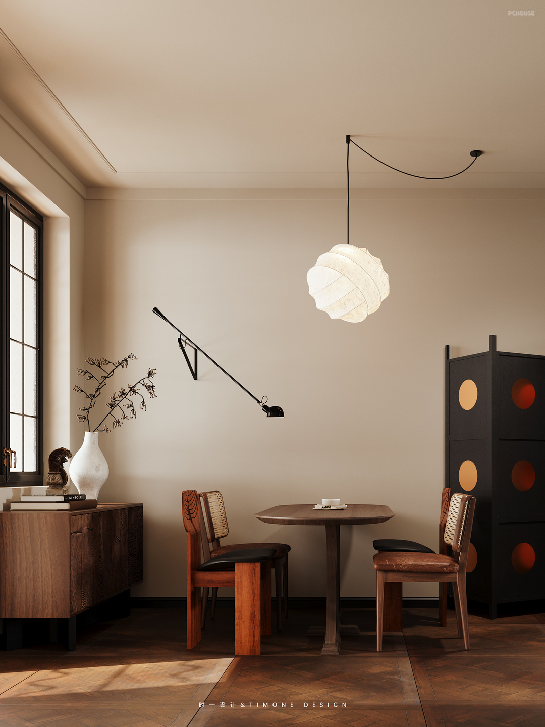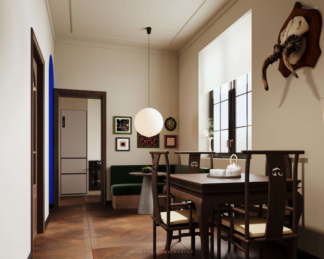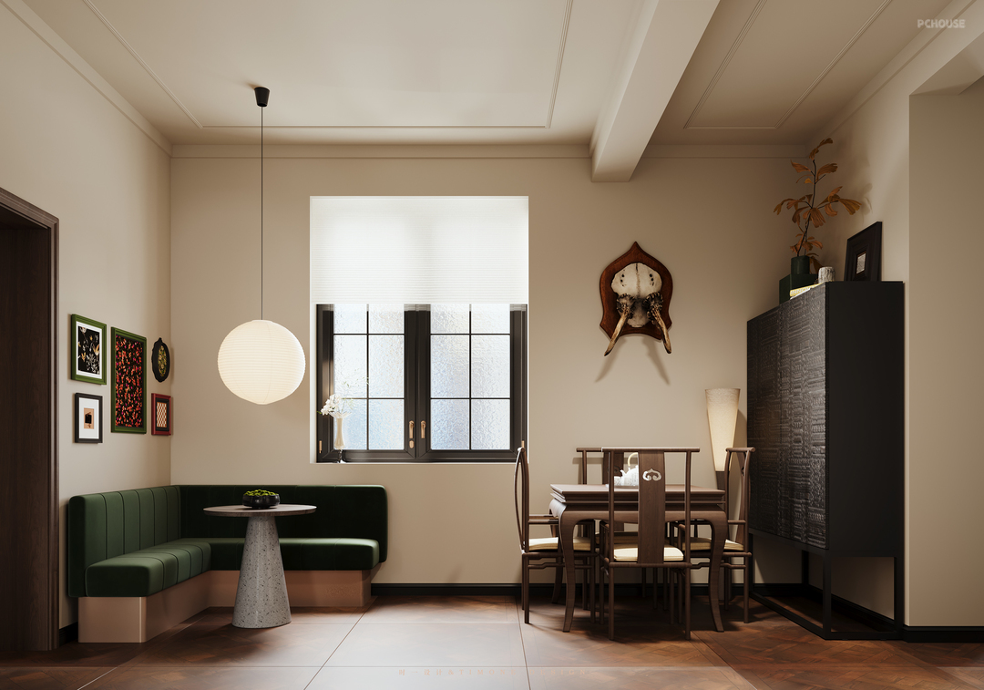 最先看见的一定是大大的圆球,这是餐厅的主光源了,石材圆形餐桌平时一家三口已经足够使用,绿色、白色、原木色...搭配上也和旁边充满年代感的餐桌完美融合,中古风成品柜收纳在这里已经足够了,随意搭配一株绿植就是一道风景点