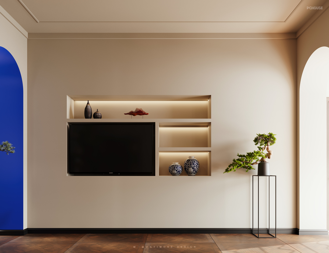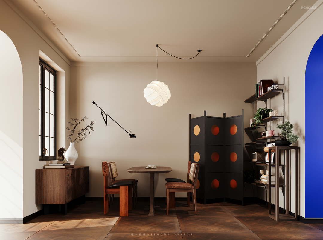 嵌入墙面的电视背景和开放展示收纳,真的很爱!壁灯延伸至餐桌区,即使充满法式元素的吊灯不打开,也是氛围感满满的,墙角的折叠屏风随时可移动,如果需要私人空间也能起到一定的遮挡作用,平时也能作为装饰功能