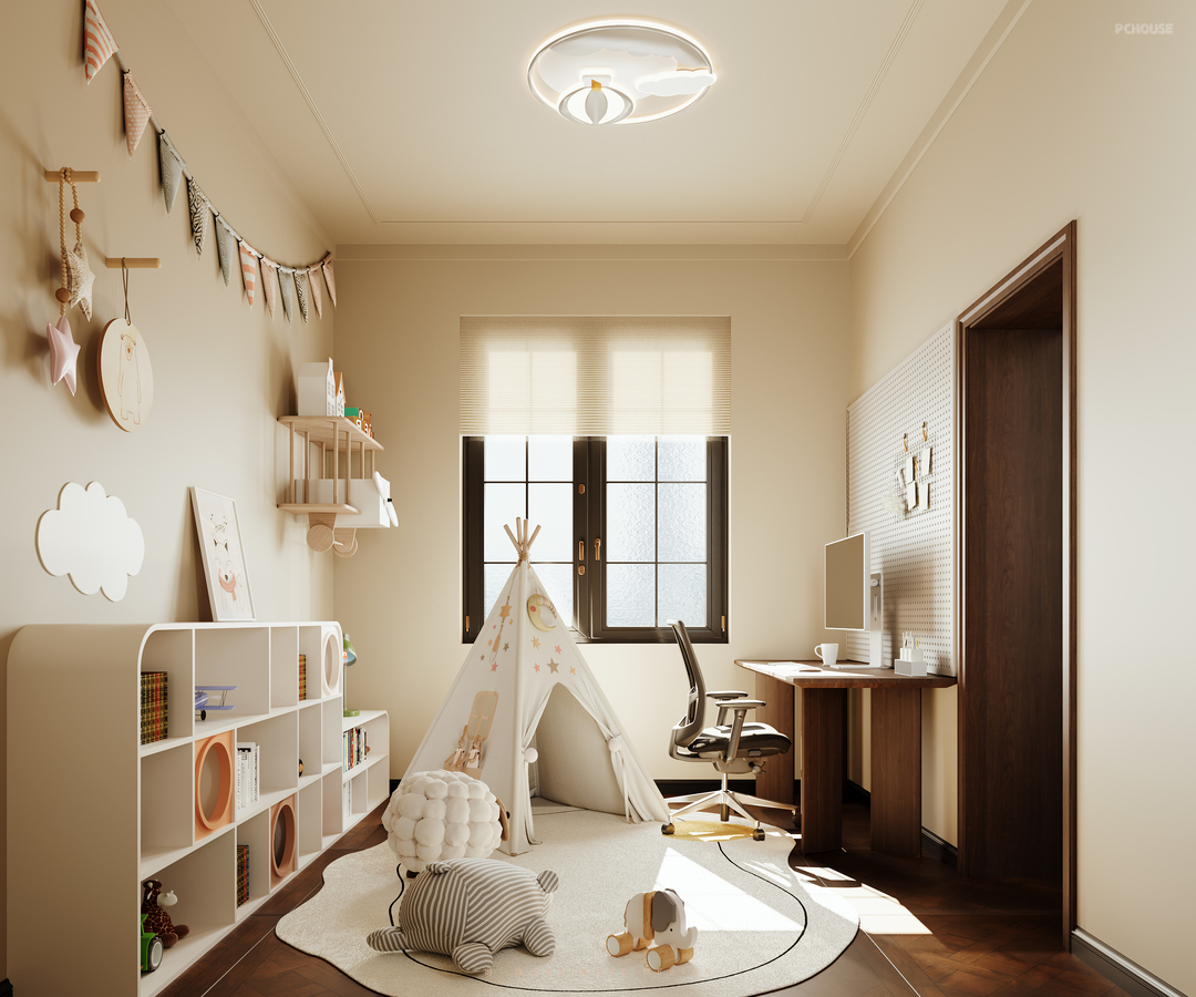 户型相对而言较小,自然功能也会多一些,客厅融合了餐厅、书房等功能,同时也是屋主在家办公的场所,设计上考虑到空间的通透性和采光,开放式收纳上墙式设计是最好的搭配,满足收纳也能尽可能的减少空间的占用