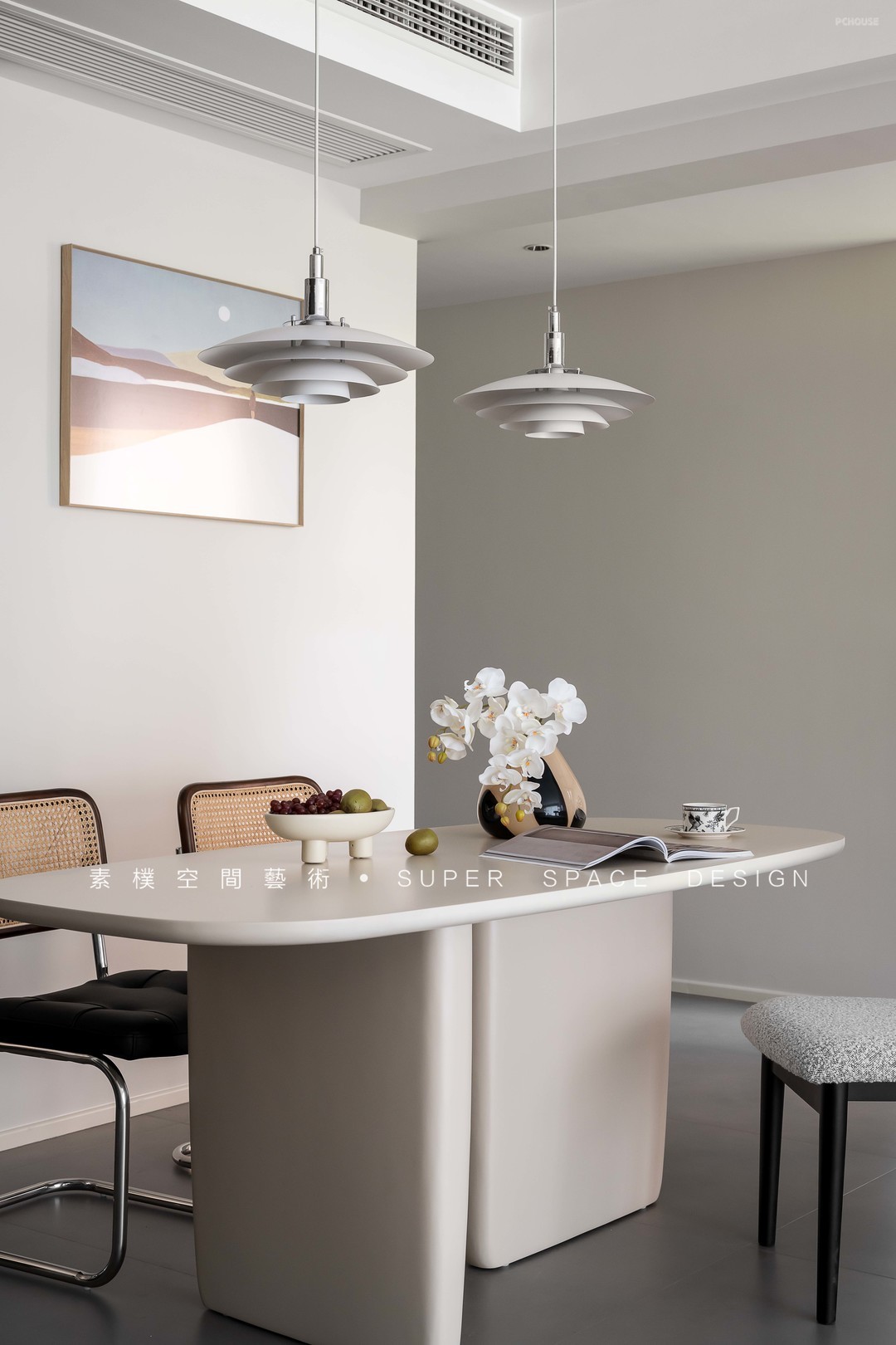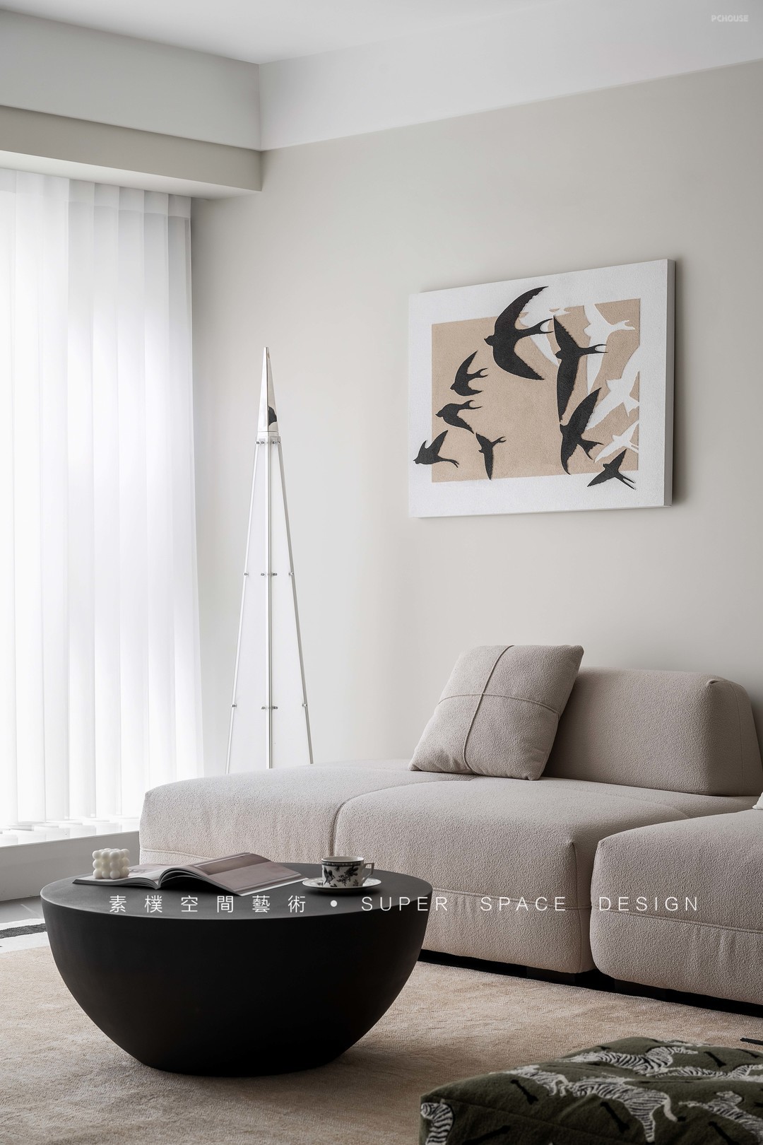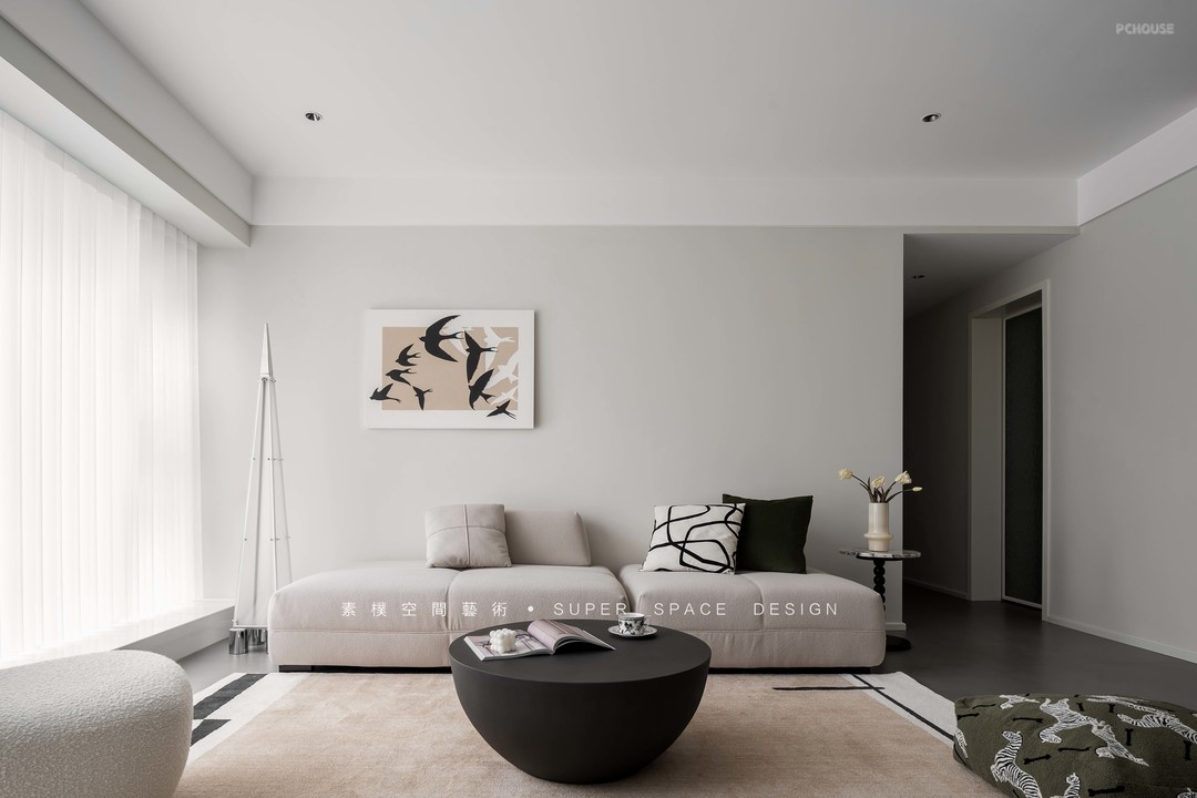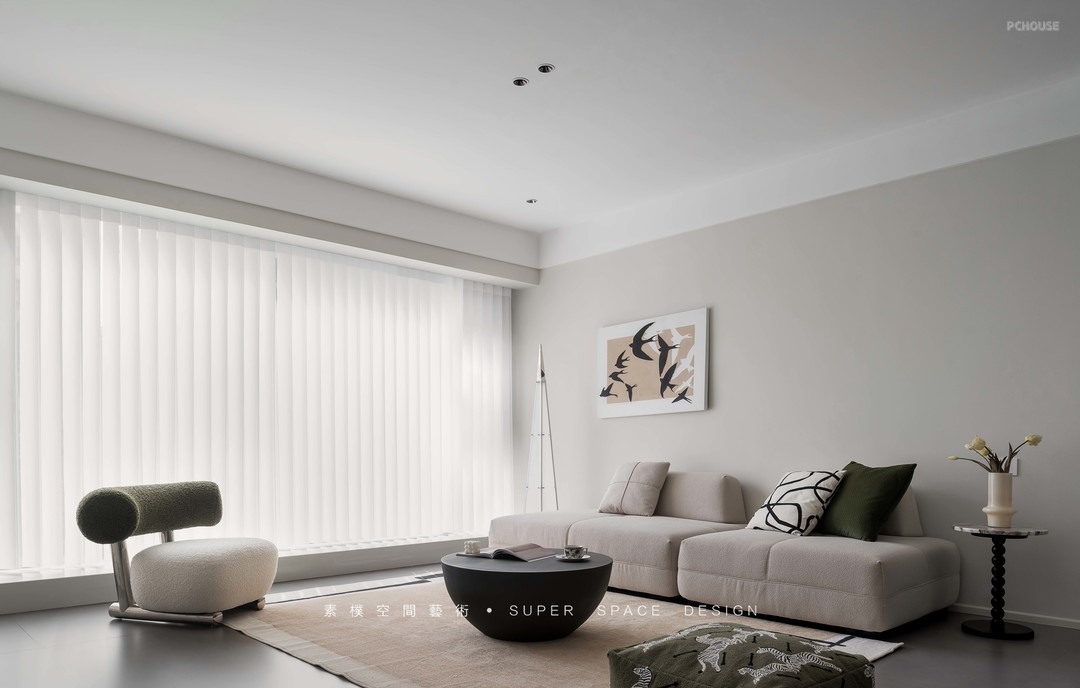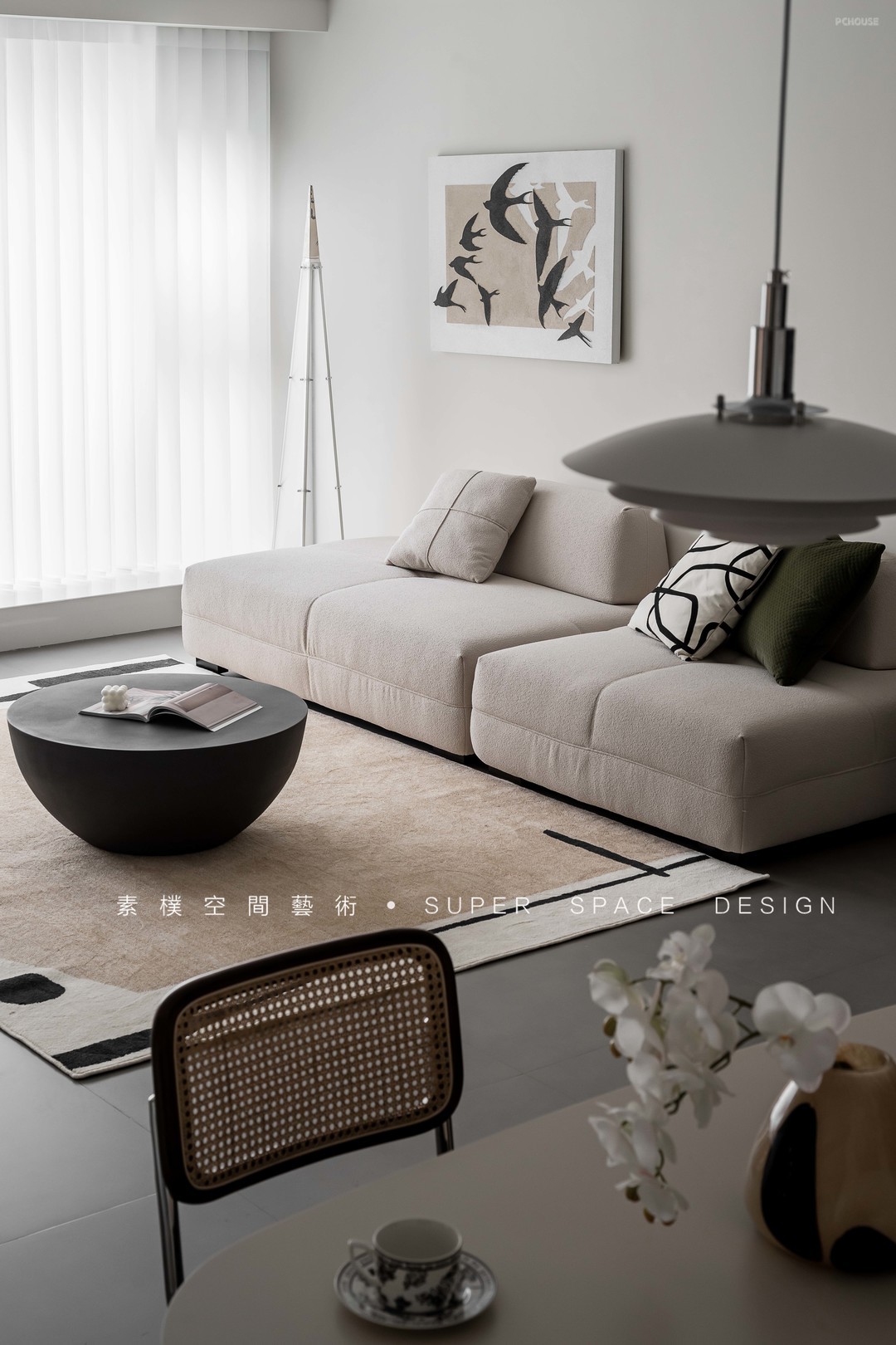 在设计上,大面积采用柔和的奶白色,再搭配米色的沙发、美拉德色系的茶几和地毯,以及充满原创感的落地灯;低饱和度的挂画、自然感的坐垫和单椅作点缀,升华和对比的视觉并不冲突,反倒让空间更加灵动。