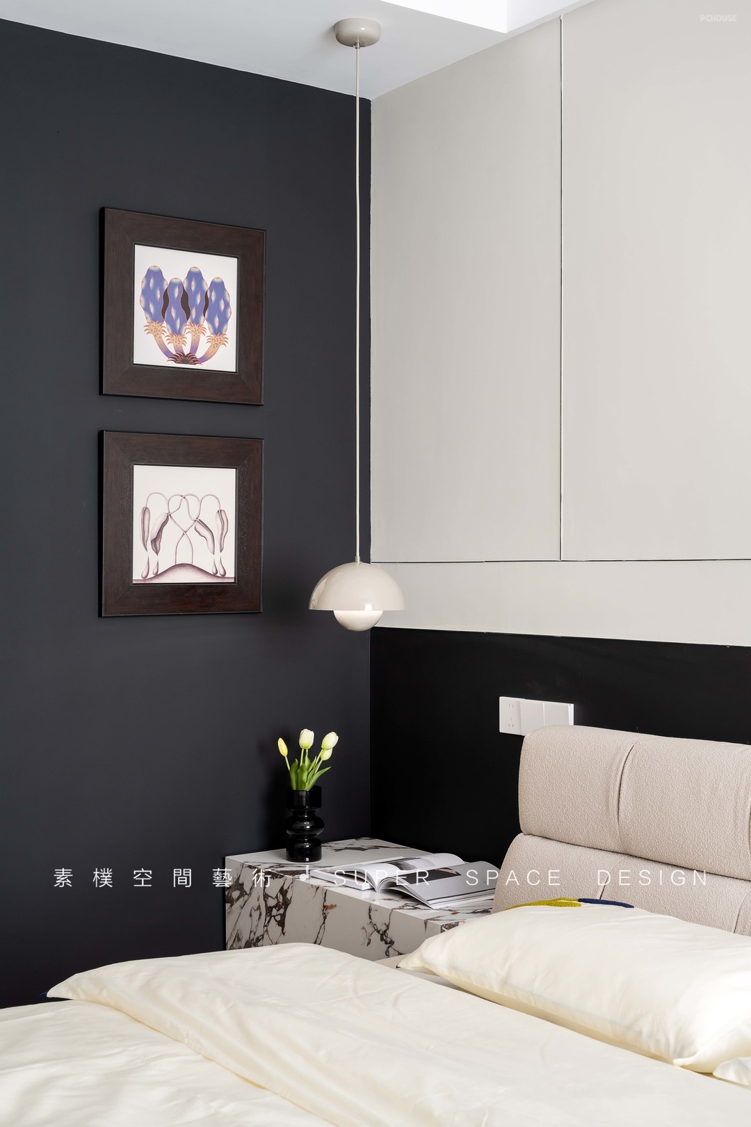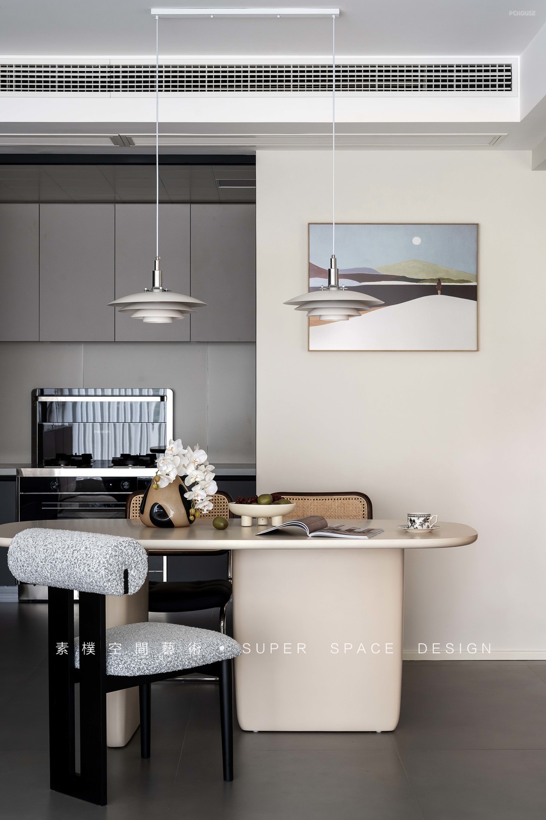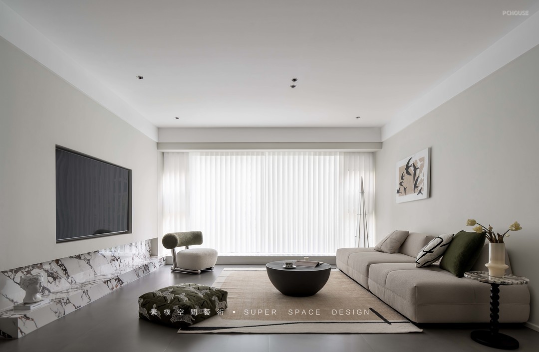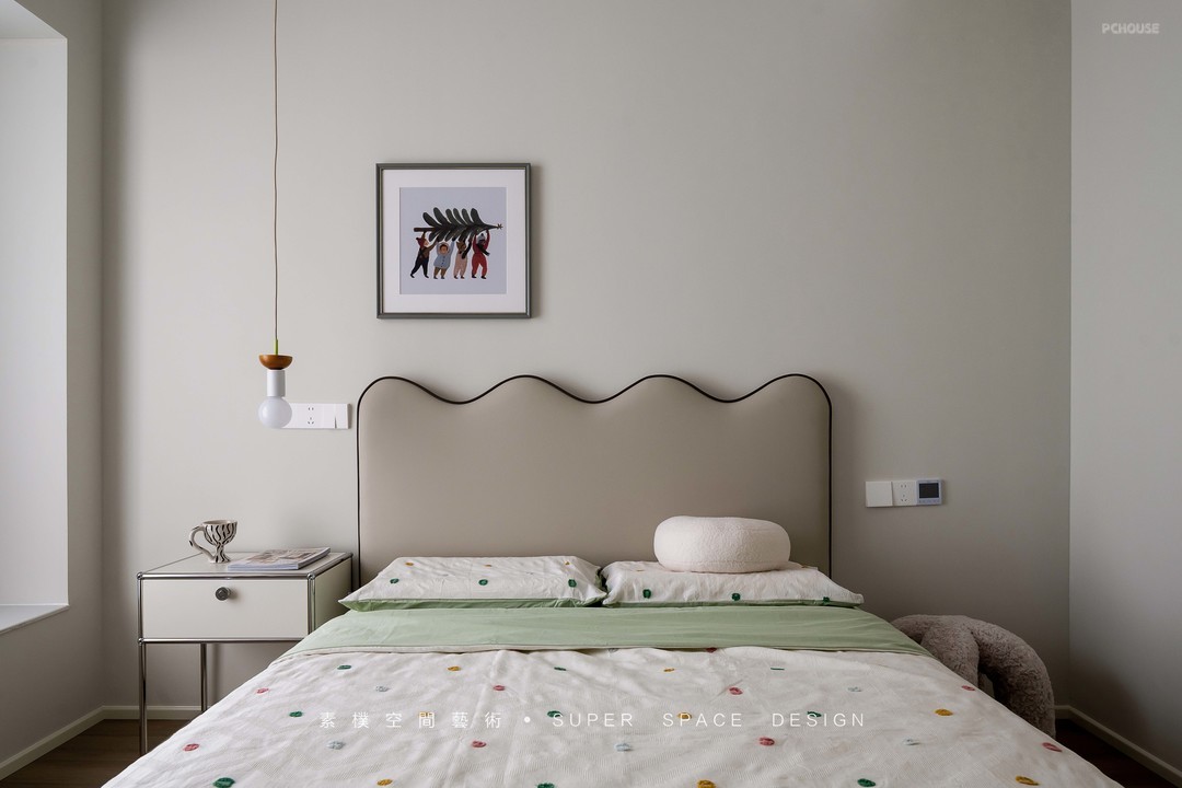 在设计上,大面积采用柔和的奶白色,再搭配米色的沙发、美拉德色系的茶几和地毯,以及充满原创感的落地灯;低饱和度的挂画、自然感的坐垫和单椅作点缀,升华和对比的视觉并不冲突,反倒让空间更加灵动。