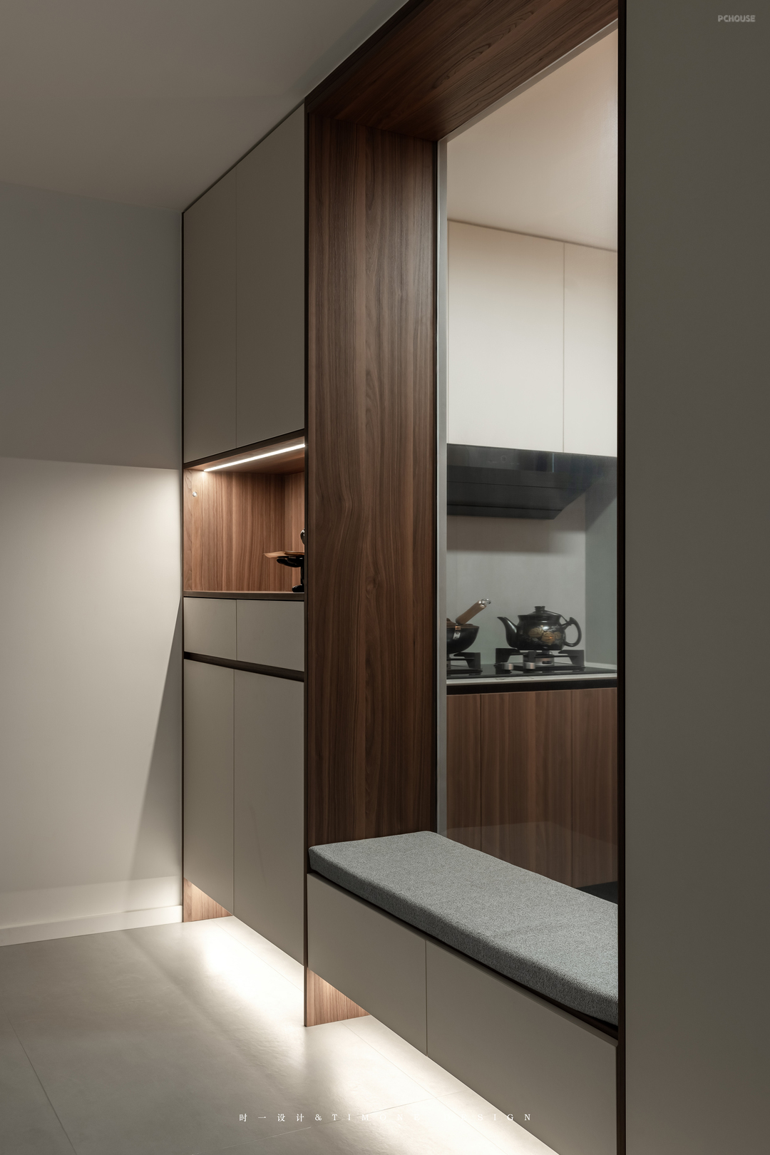 ①取掉笨重的玄关隔墙,重新排布收纳,既开阔入户第一感官,又为厨房备餐添了一份互动的乐趣。