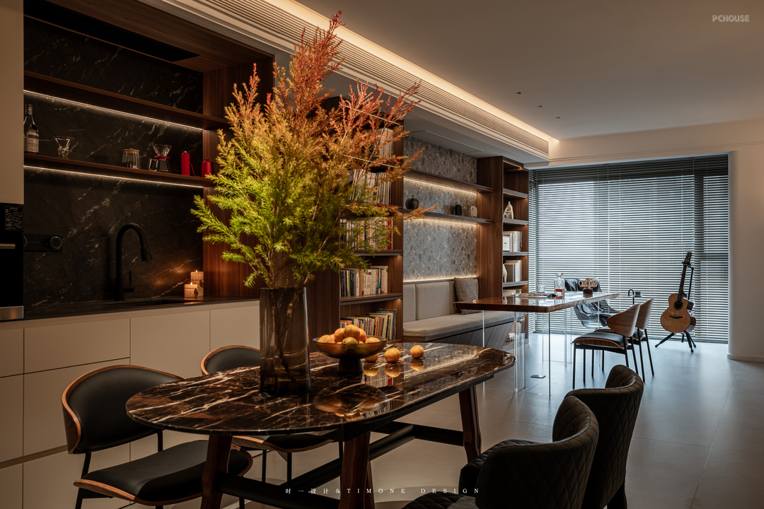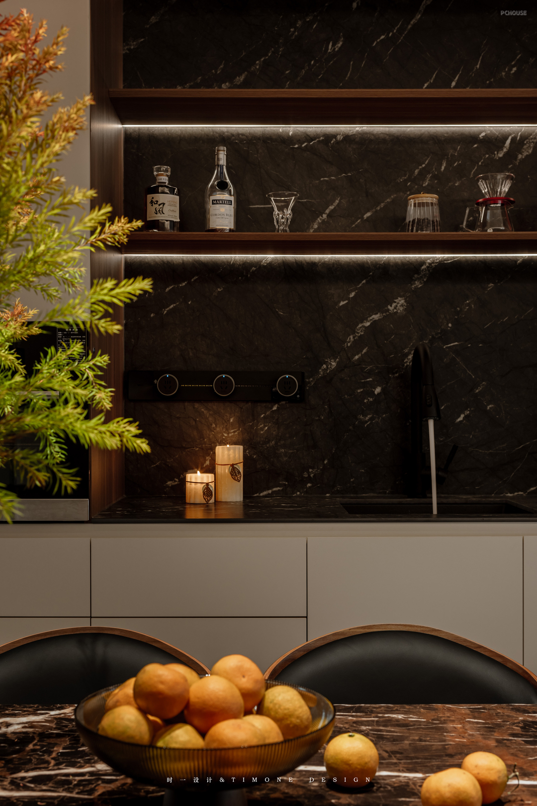 ②餐边井然有序归置内嵌冰箱,蒸烤箱,茶水吧,一应俱全。灯光起餐一家人,浪漫了四季