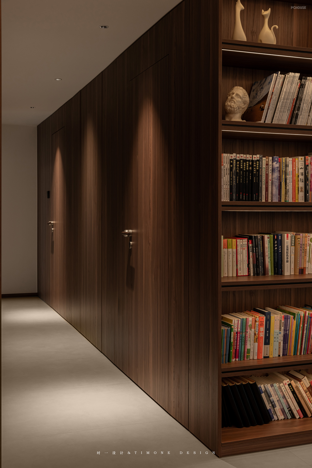 ⑤廊道整体胡桃木的墙板,不仅把四扇房门融合"隐藏"起来,更是又增设了满满一组收纳空间,再繁多的杂物也能妥善归置其中