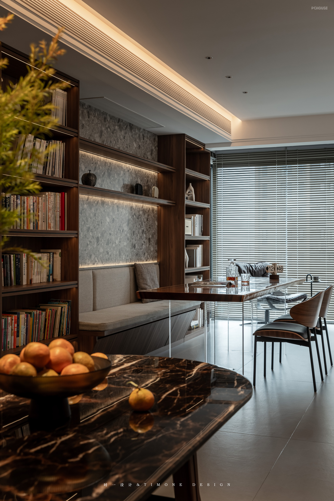 ③打破传统板正的客厅,书架结合卡座的巧思又何尝不是居家更好的选择,至此,畅谈,学习,亲子