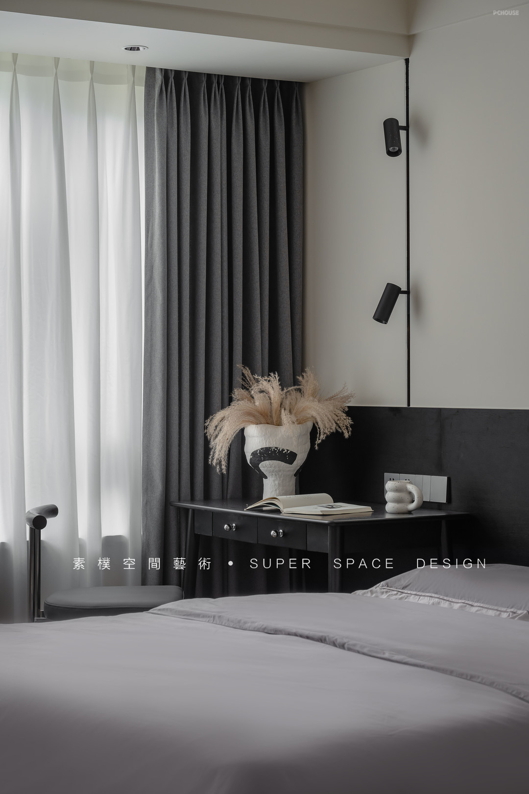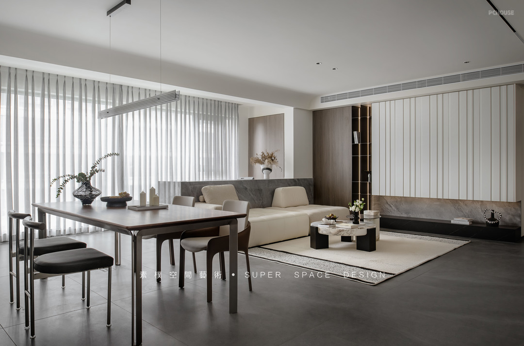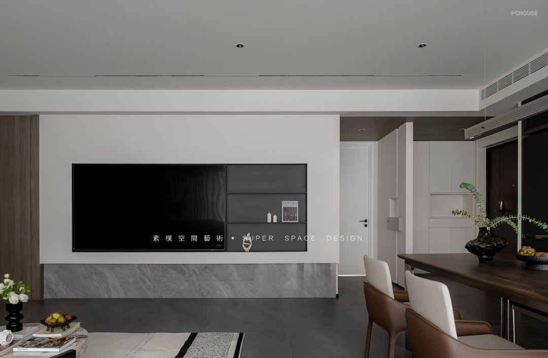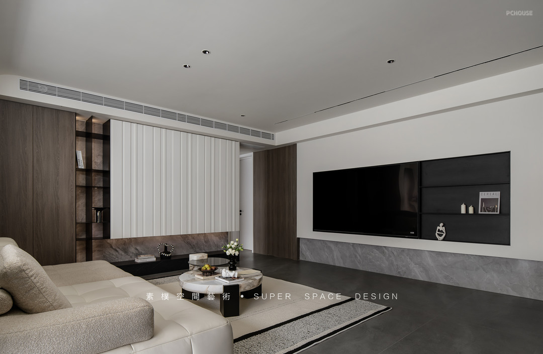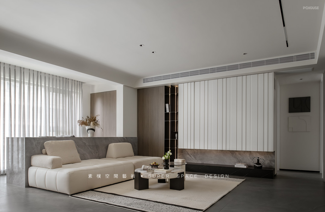 1.阳台纳入客厅区域、公区宽阔,电视墙做到过道方向把原本的过道区域置换为客厅,原有电视墙位置做满墙收纳。窗边延伸承重墙做开放式书吧,承载办公需求的同时也可以满足孩子上网课的需求。电视大且视距远,能有效保护孩子视力。