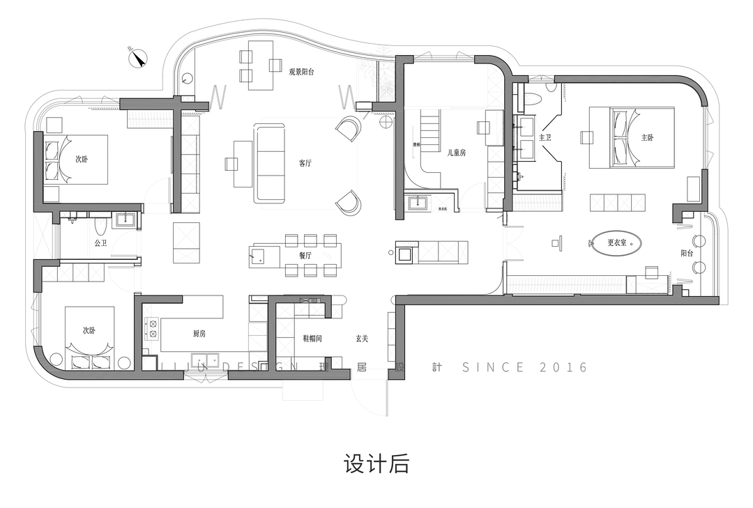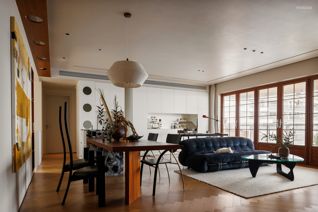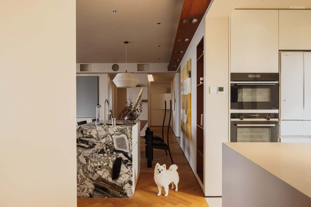 秉持精简社交的杨女士,更加看重家庭关系,将父母、外婆接来同住,就构成了五个大人+三狗两猫的大家庭。虽然是233㎡的大尺度空间,但也得精细规划,要便于家庭互动,更要让大家有相对独立的自由空间。