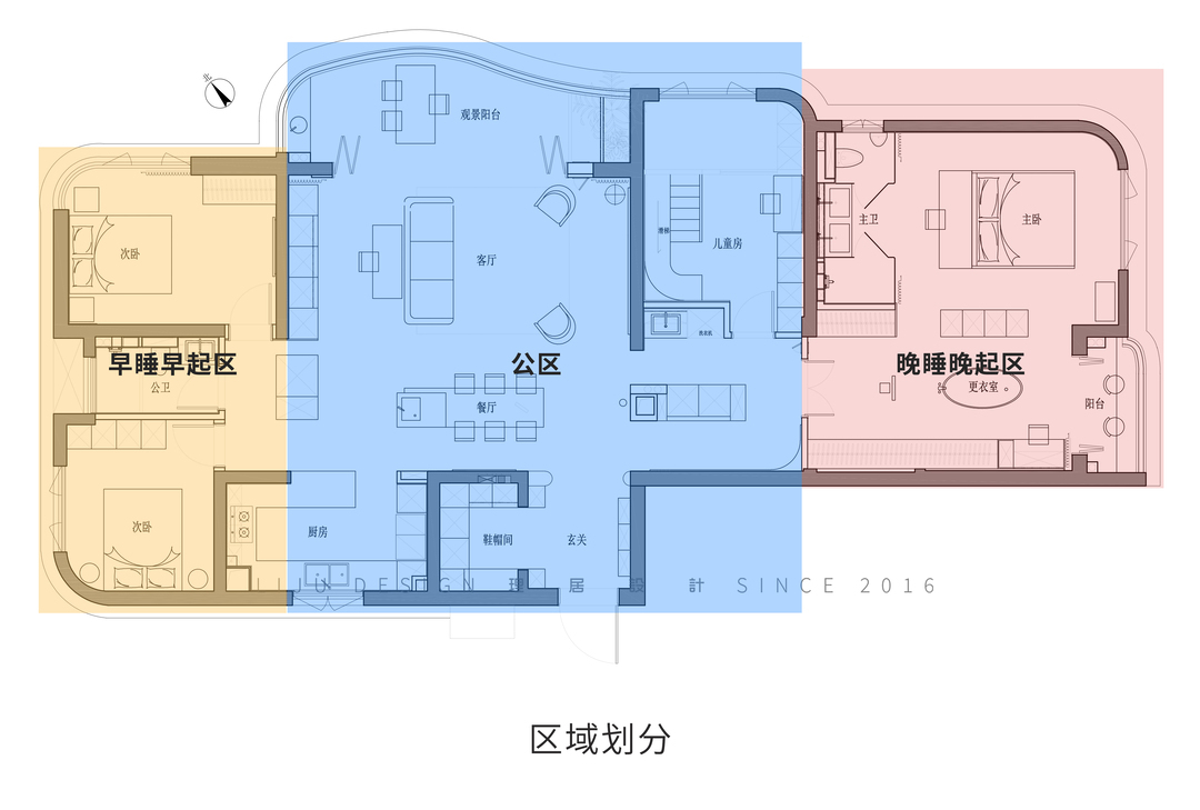 多代共居,生活习惯不同,一个家庭里有着两个时区。通过梳理功能区,将“早睡早起”的长辈区和“晚睡晚起”的青年区,以自然的方式区隔开来,长辈们的日常作息和杨女士、朱先生不会相互打扰。