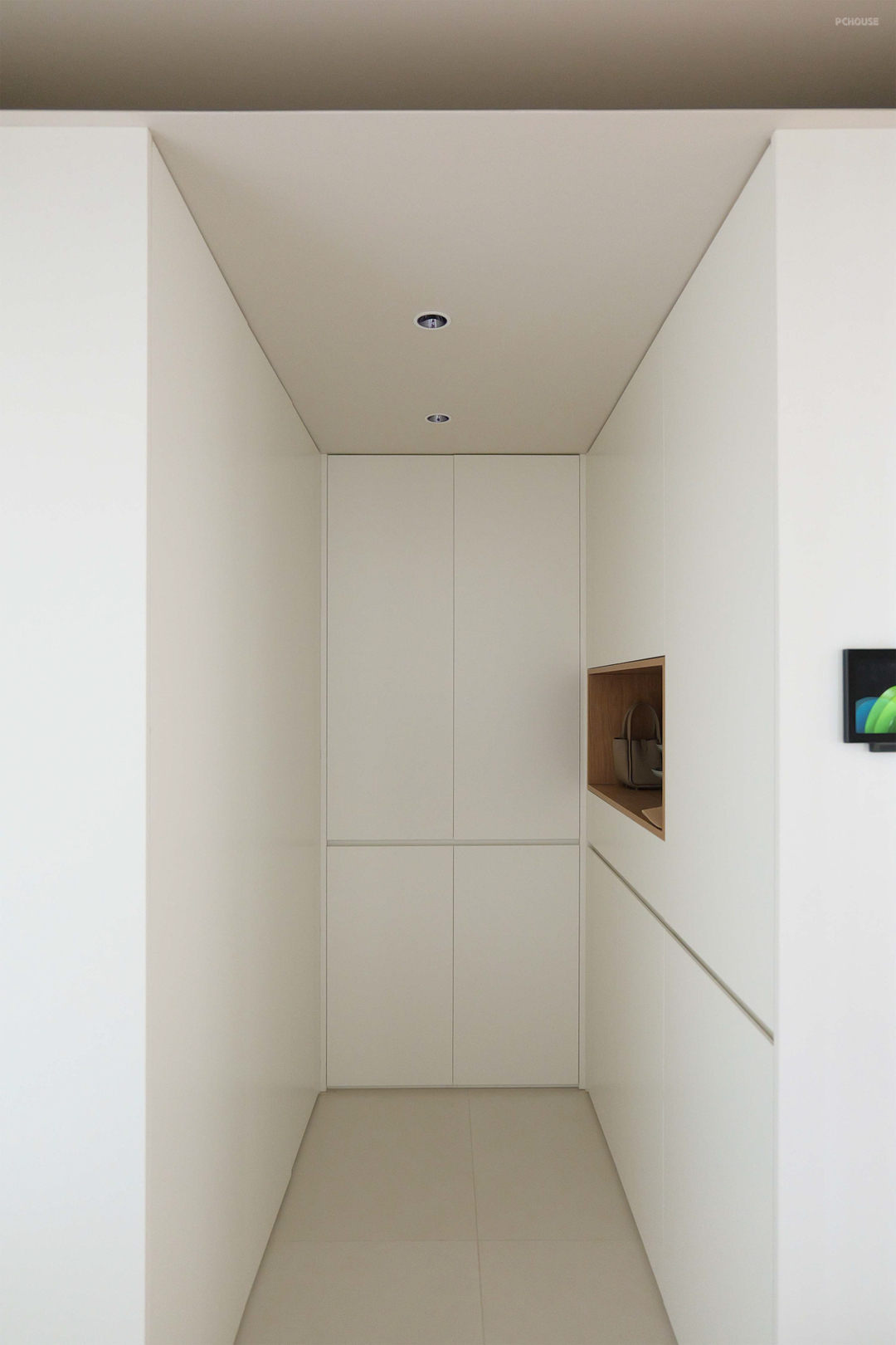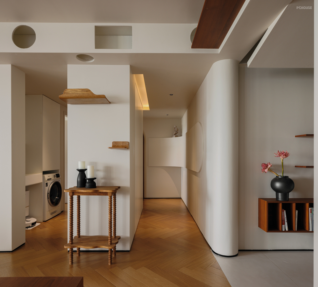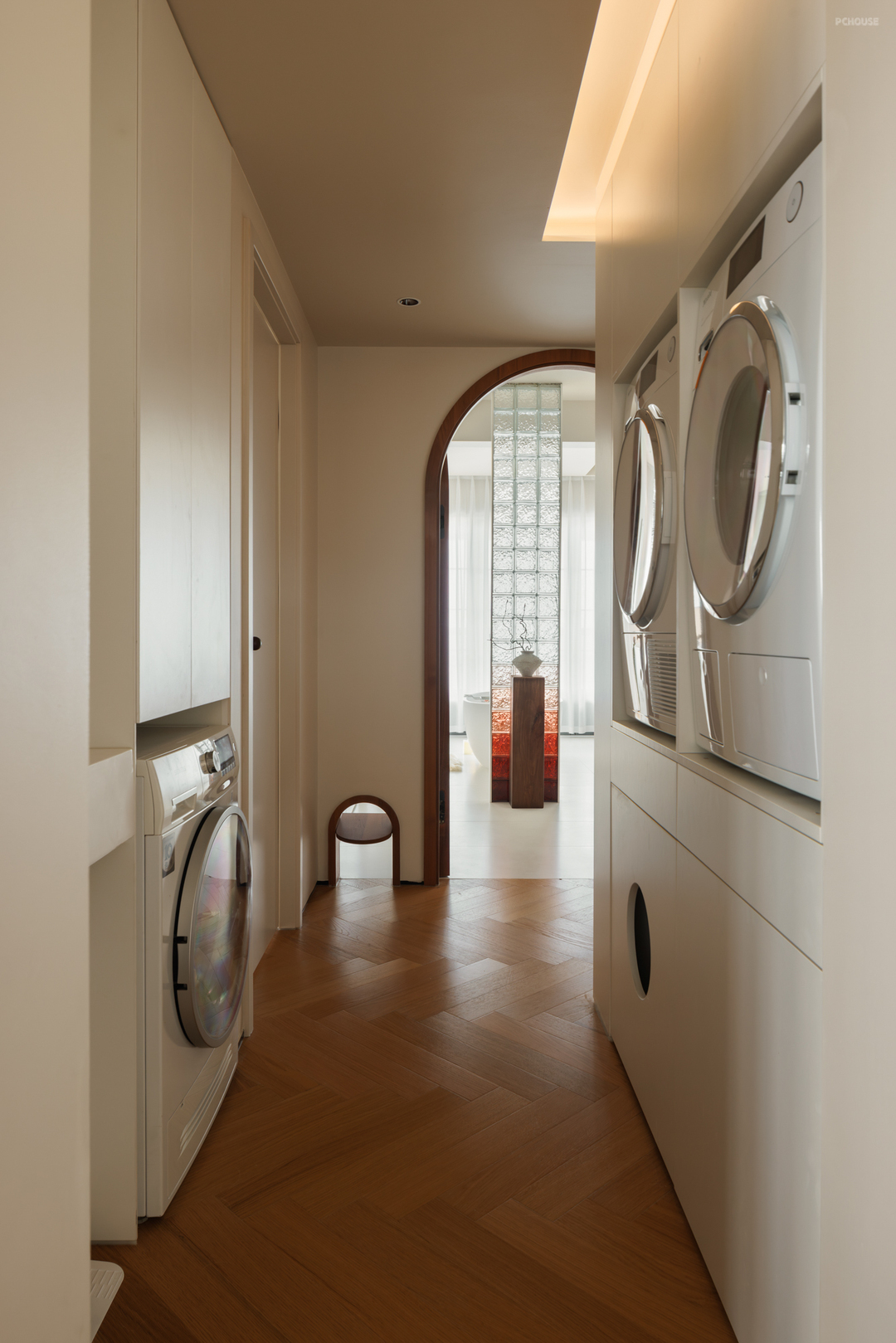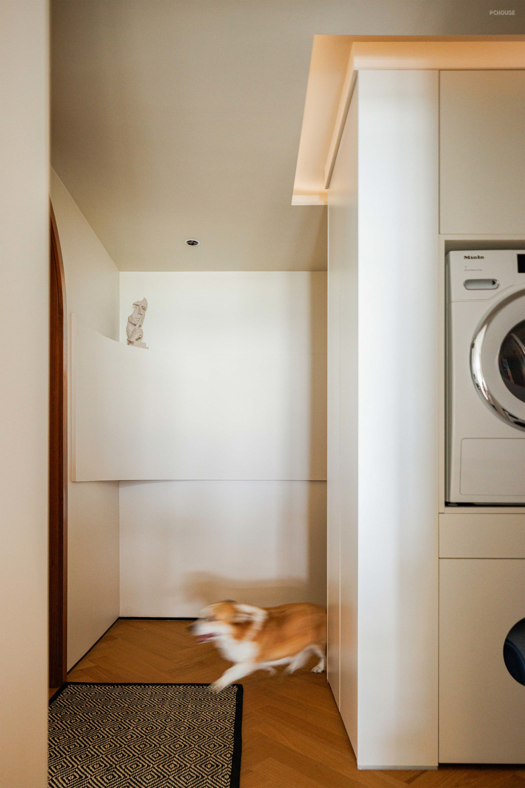 沟通主卧和公区的双通道,在一侧嵌入了所有家政杂物功能——从全家人衣物、宠物用品清洗,到狗狗的喝水点、猫猫厕所,以及家政工具、囤货的收纳,一应俱全。