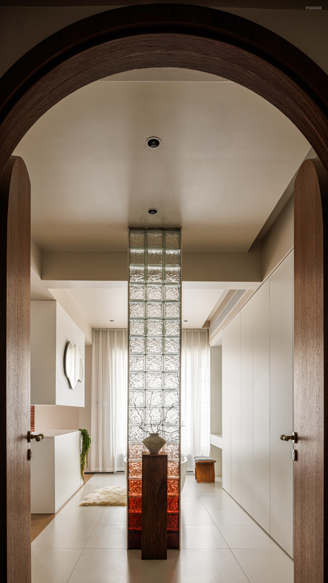 从推开双开拱门开始强调仪式感。渐变玻璃砖既是隔断,也是端景。