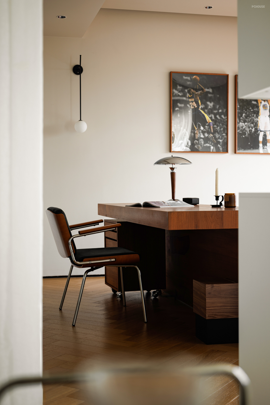 卧室的书桌也是朱先生常用的办公区。墙上挂着朱先生和杨女士最喜欢的球星照片(库里和科比),因为篮球这个共同爱好和装修的机遇,设计师涂总也和业主成为了好友。
