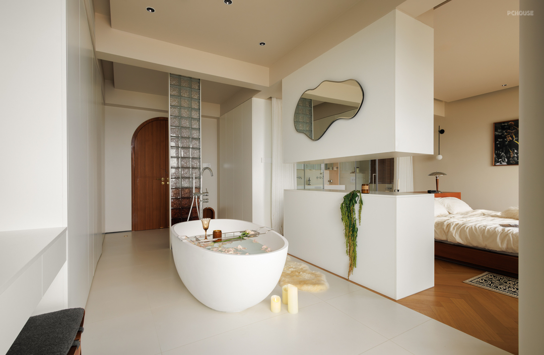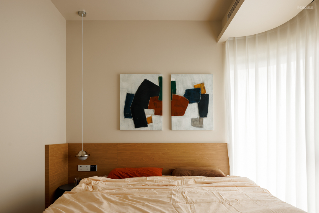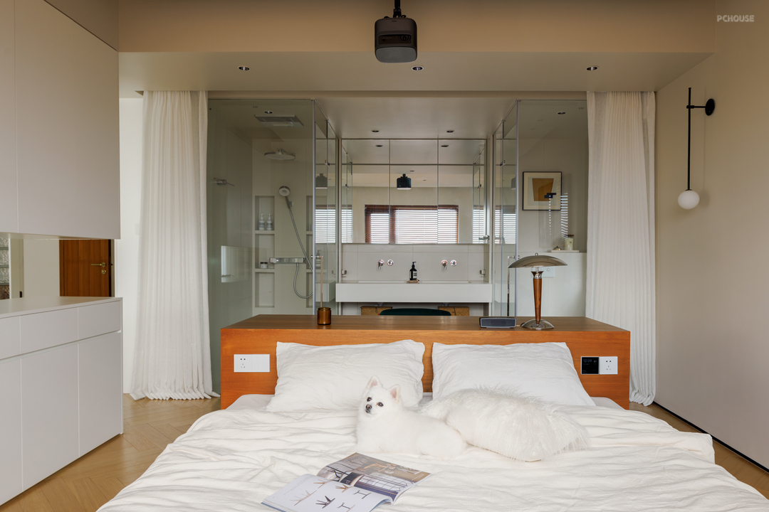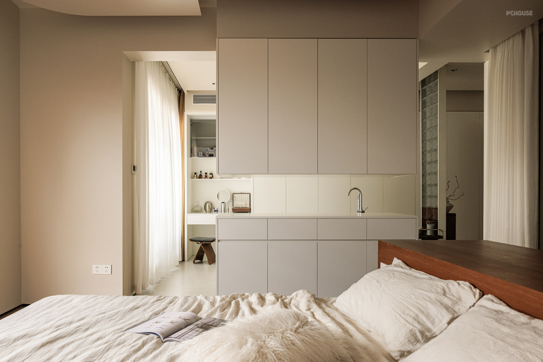 因为工作原因,杨女士和朱先生经常出差,在他们体验过的众多酒店中,尤其喜欢谢柯设计的礁石酒店,“将海景框进室内,像画一样”。所以他们希望主卧的设计,能创造出有别于传统家居空间的体验。