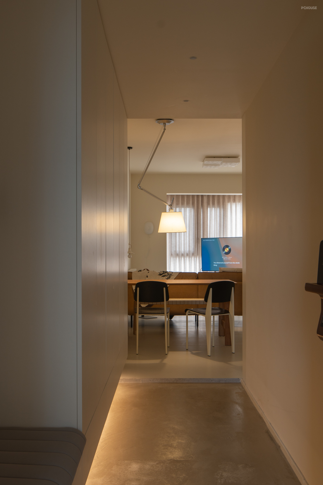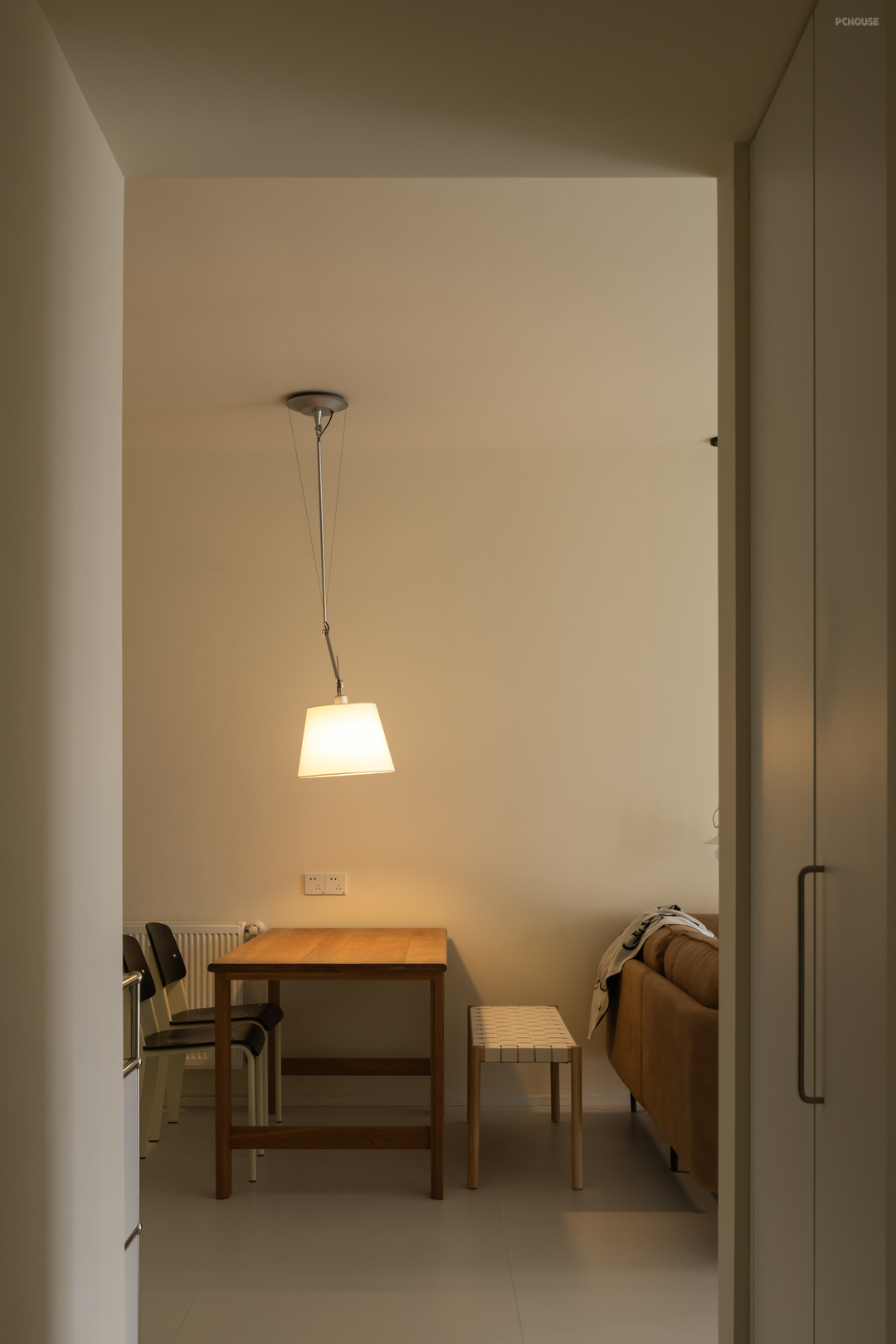 从走廊和玄关都可以看到餐厅这盏悬臂灯。在这个家里,灯光是共享的、穿透的。