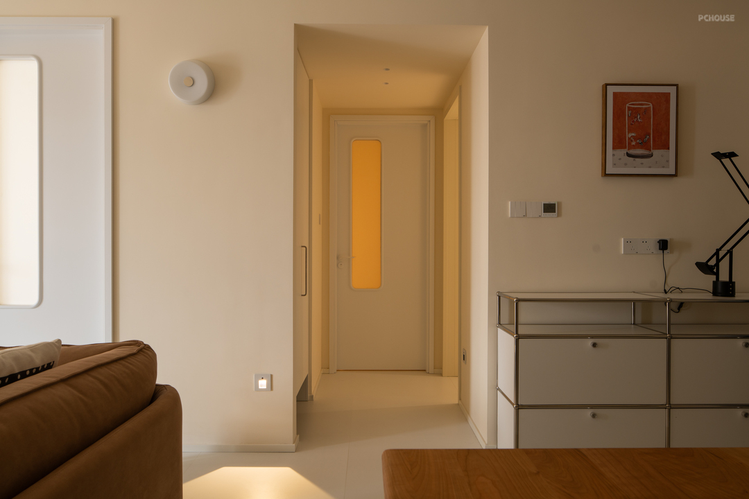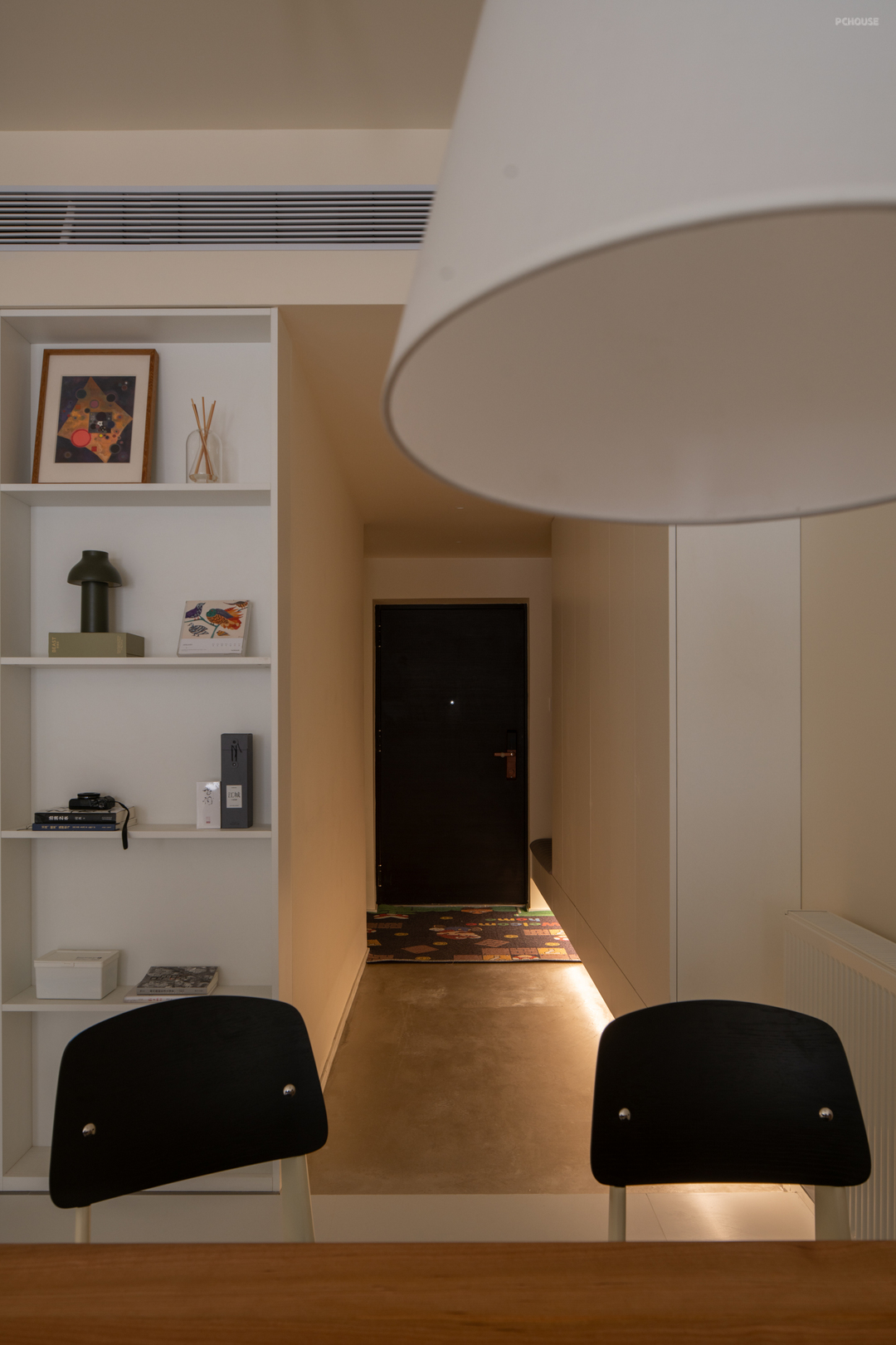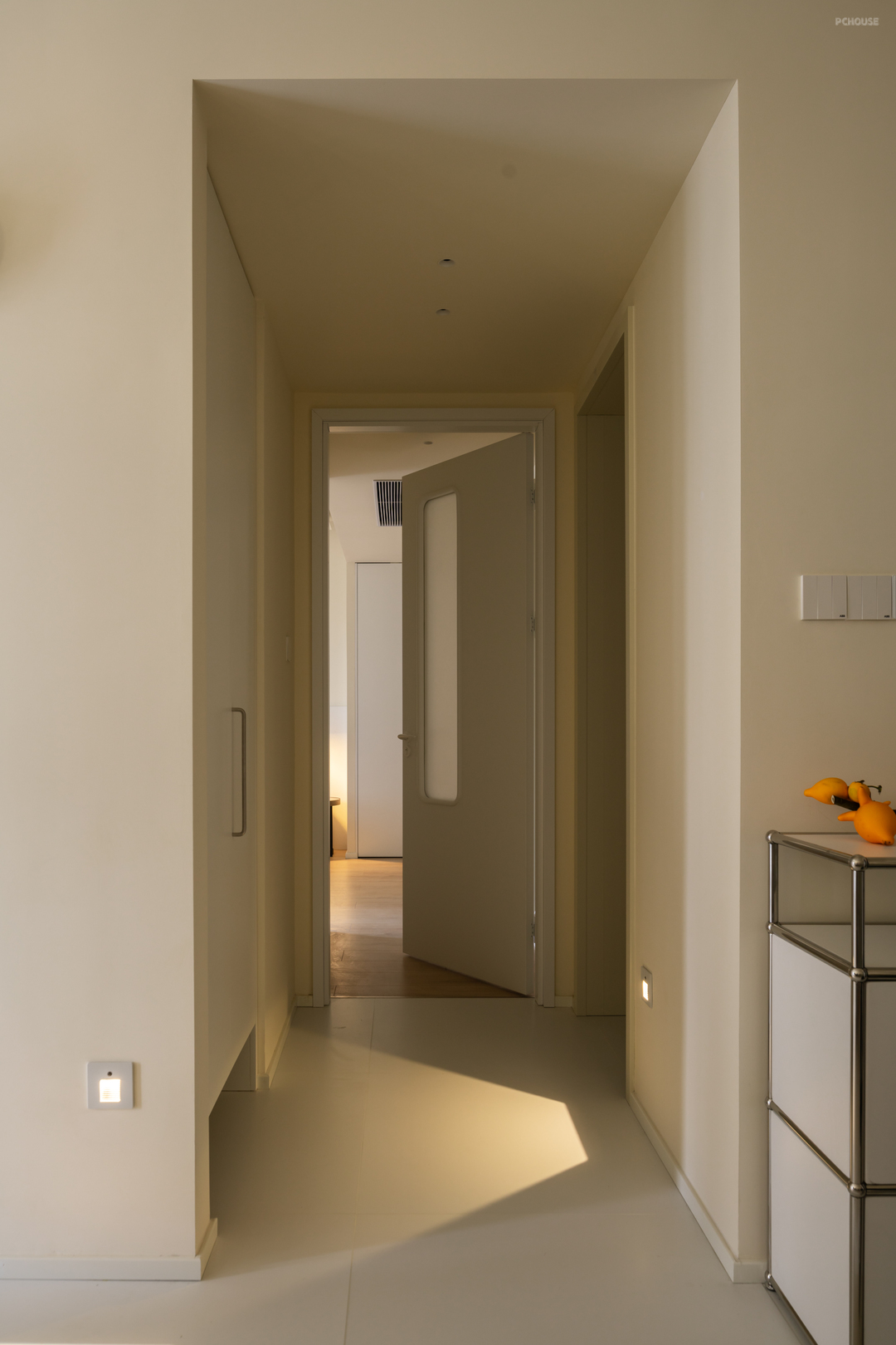 左侧墙体的凹陷和右侧玄关柜的悬空,都给长长的走廊留了“气口”,避免产生压抑封闭的感觉。
