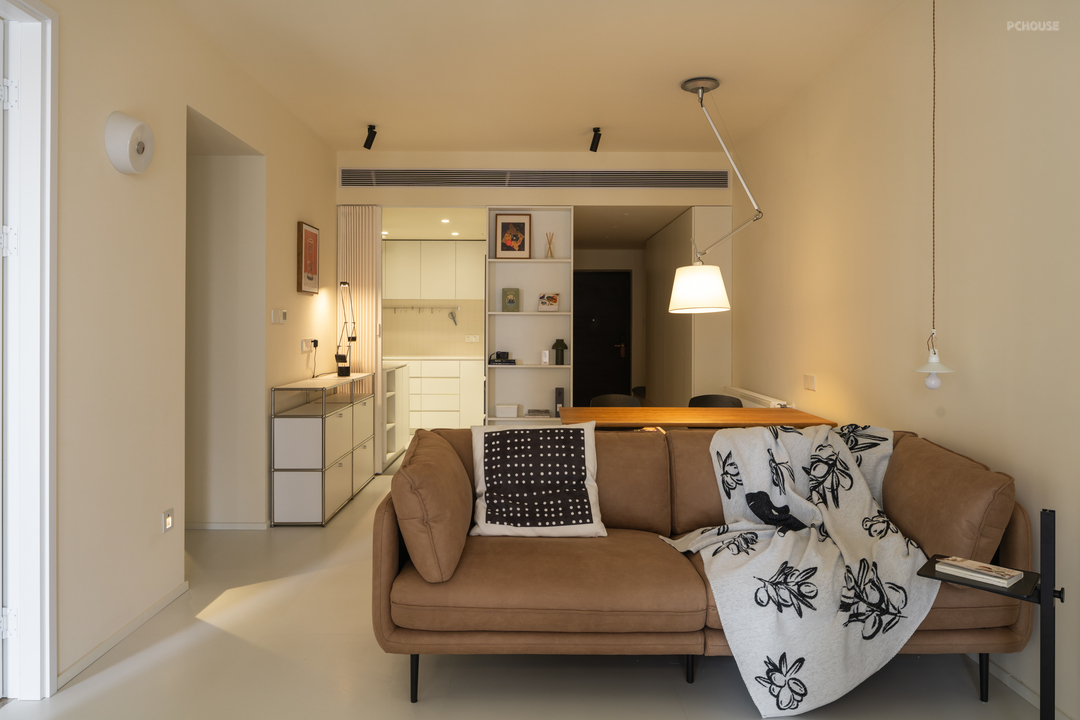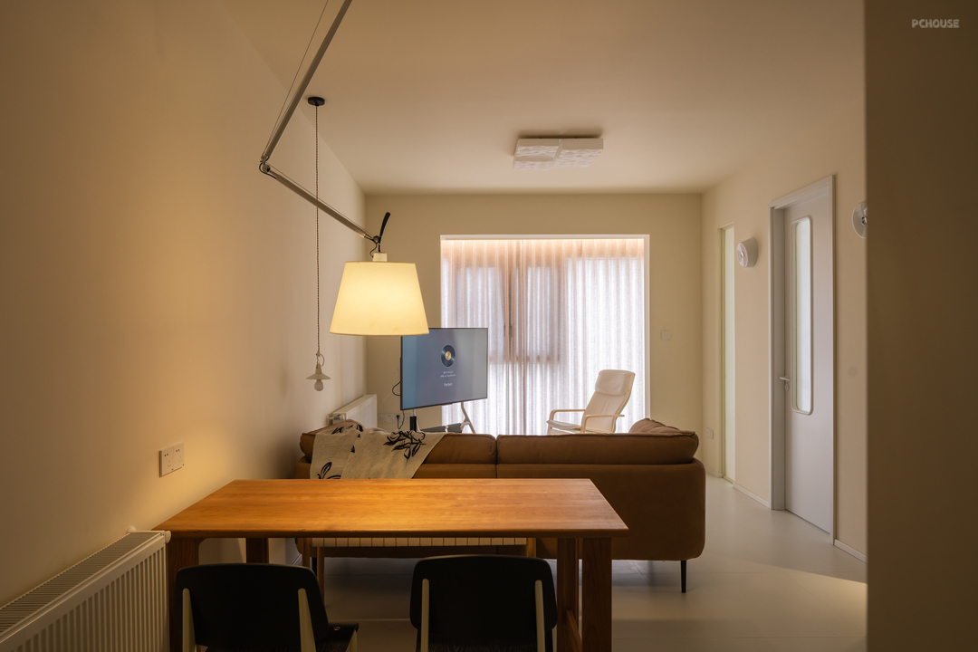 迈入起居区域。横放的1.5米实木餐桌既是用餐区、工作区,也充当了入户岛台的功能。