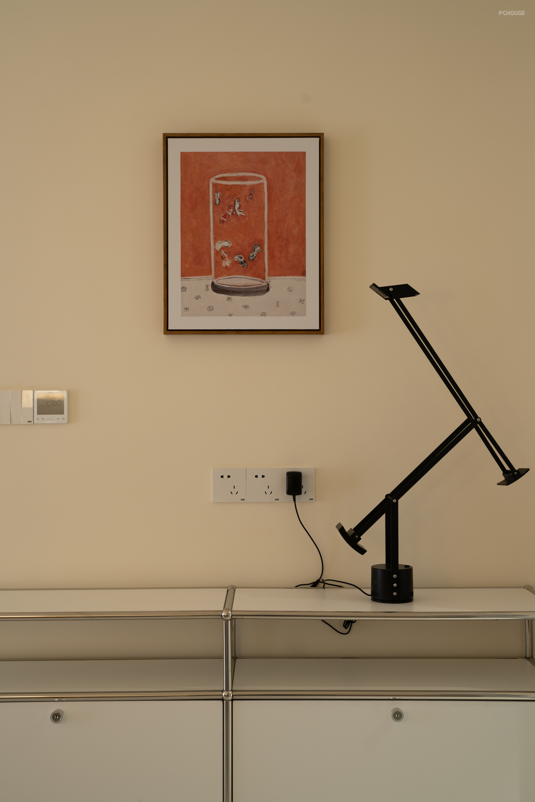 墙上挂着常玉的画作《牧童与水牛》,宛如在墙上开启了一道遥远的梦境。吊灯来自宜家里斯比恩 RISBYN。