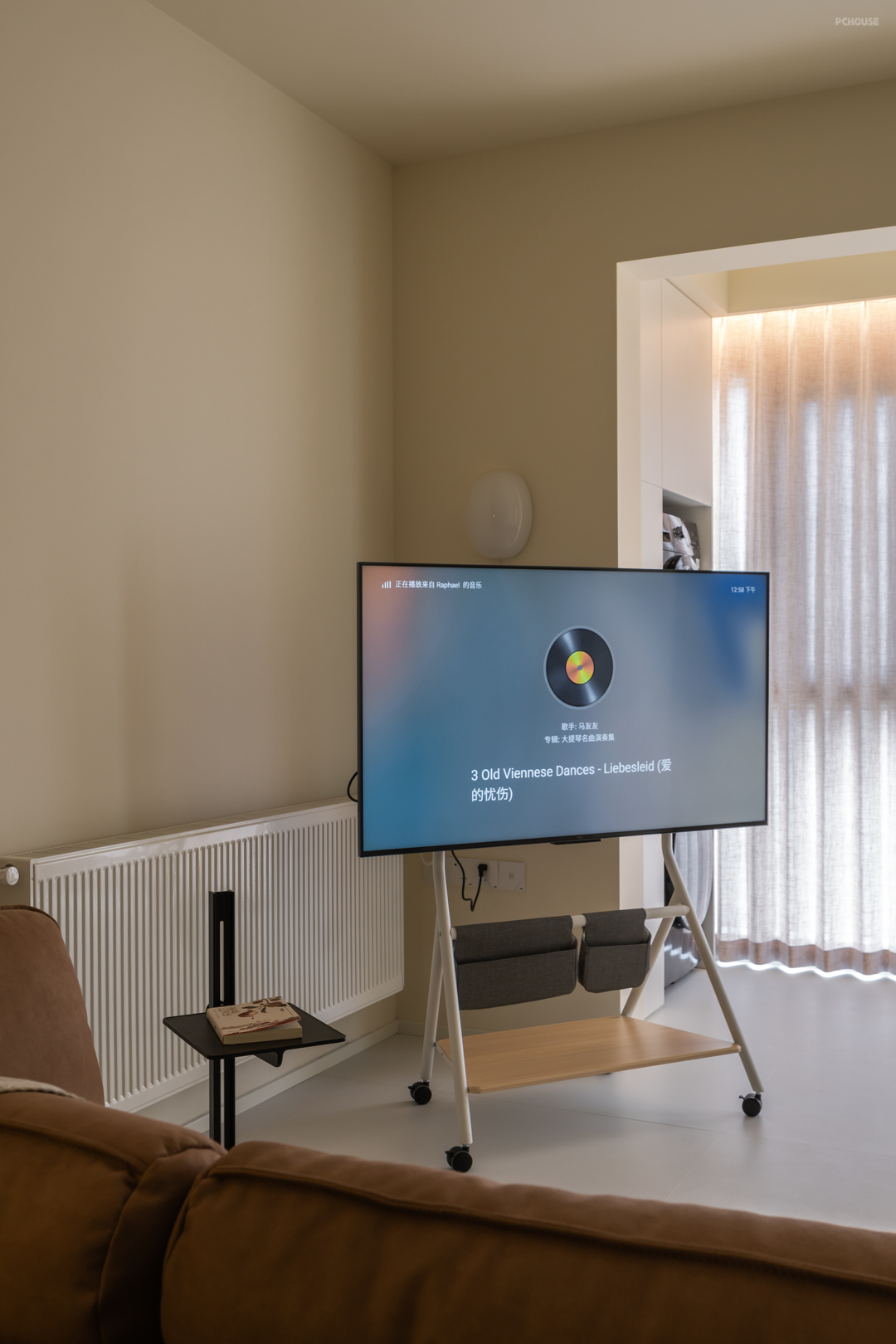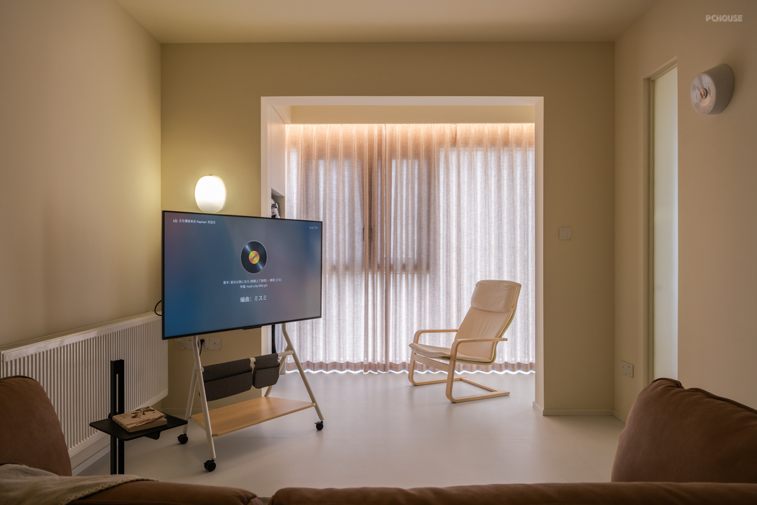 窄边框电视搭配滑轮支架,打造可移动的电视区。背后的壁灯来自宜家,型号为 KALLBLIXT 考布利。
