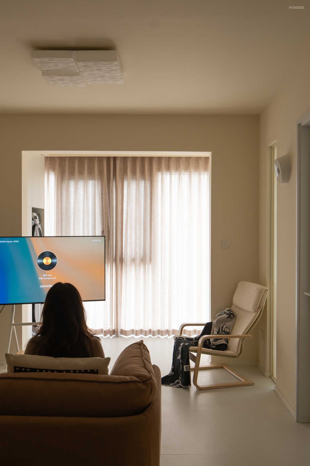阳台包进客厅之后,客厅的活动空间得到扩展,布局也更为灵活。阳台垭口的两侧都留有插座,屋主可以根据使用场景,将电视移动到任意一侧使用。