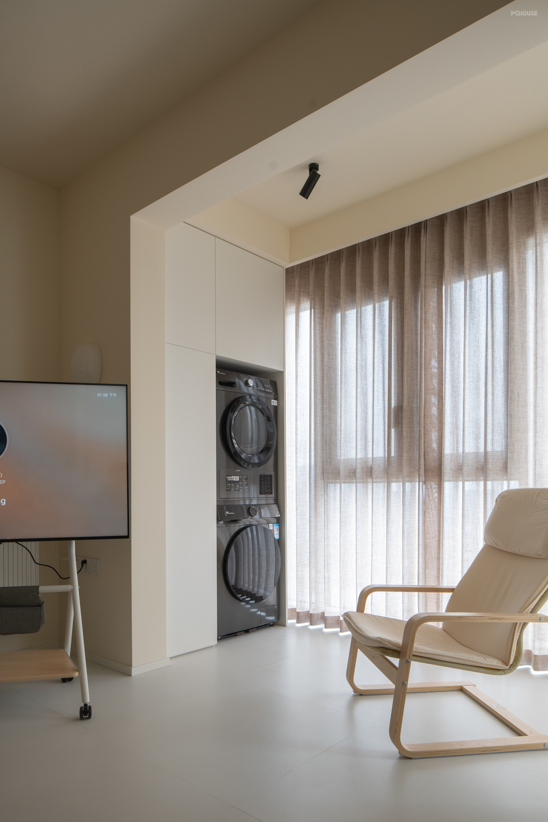 阳台的角落是集合了洗衣、烘干、收纳功能的阳台柜。