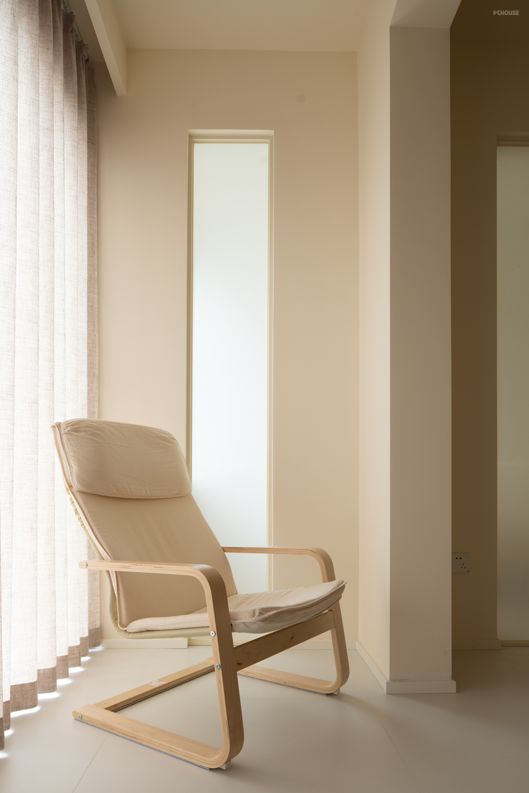 阳台的另一侧划给了书房,留下一道采光窗。这里就成了一个休闲区,躺椅来自宜家 PELLO 佩洛。