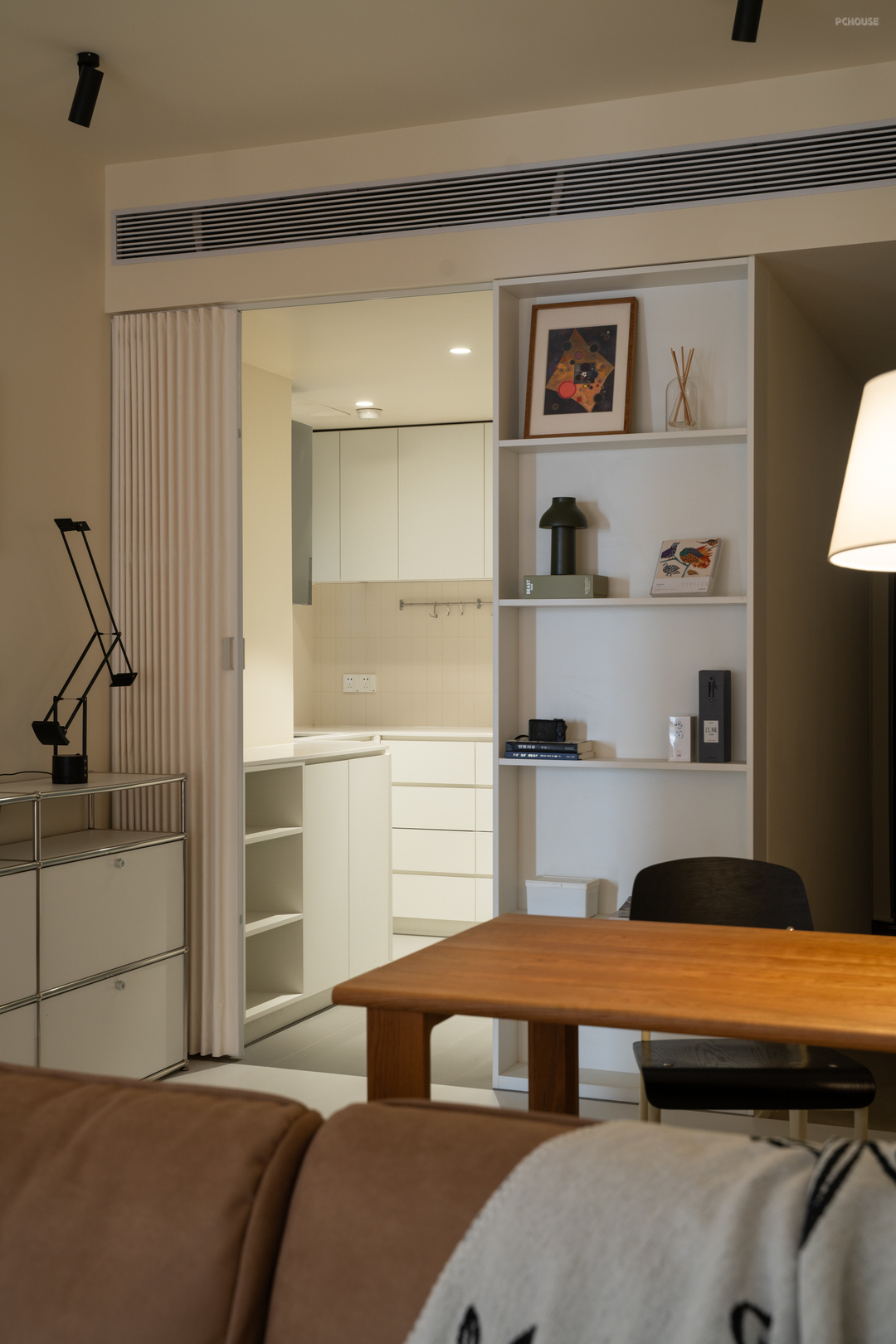 厨房门采用了PVC折叠门,开门状态下收纳在柜子和台面的夹缝中,不占地。