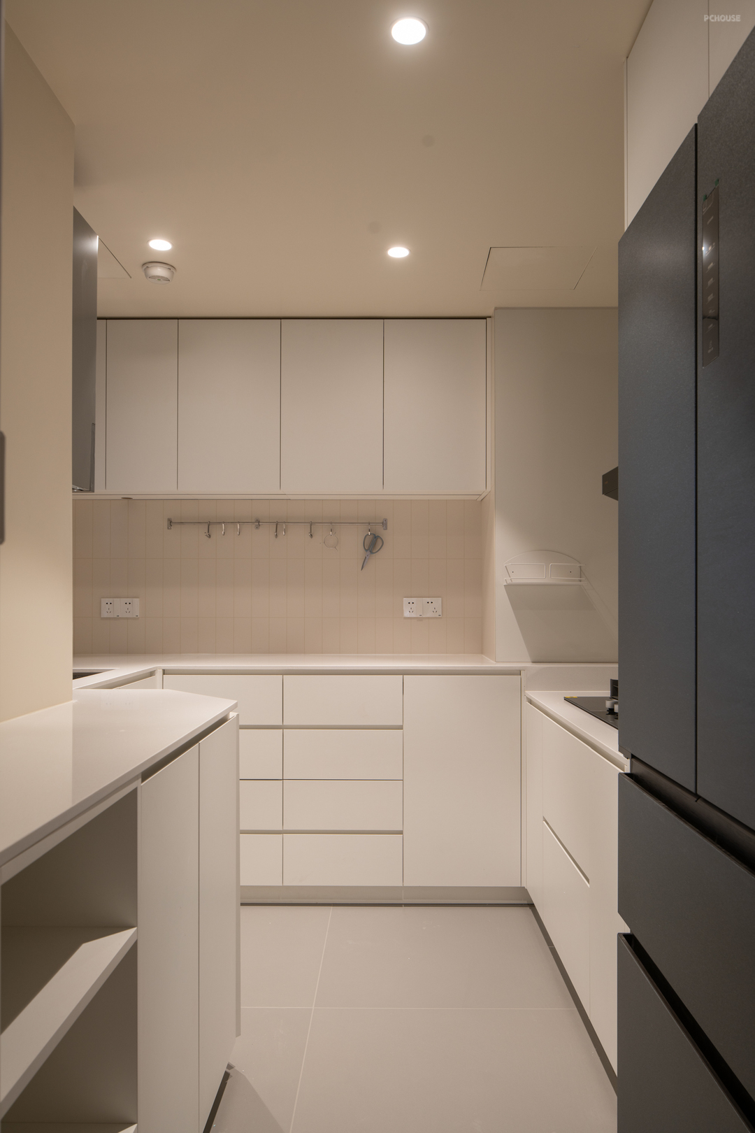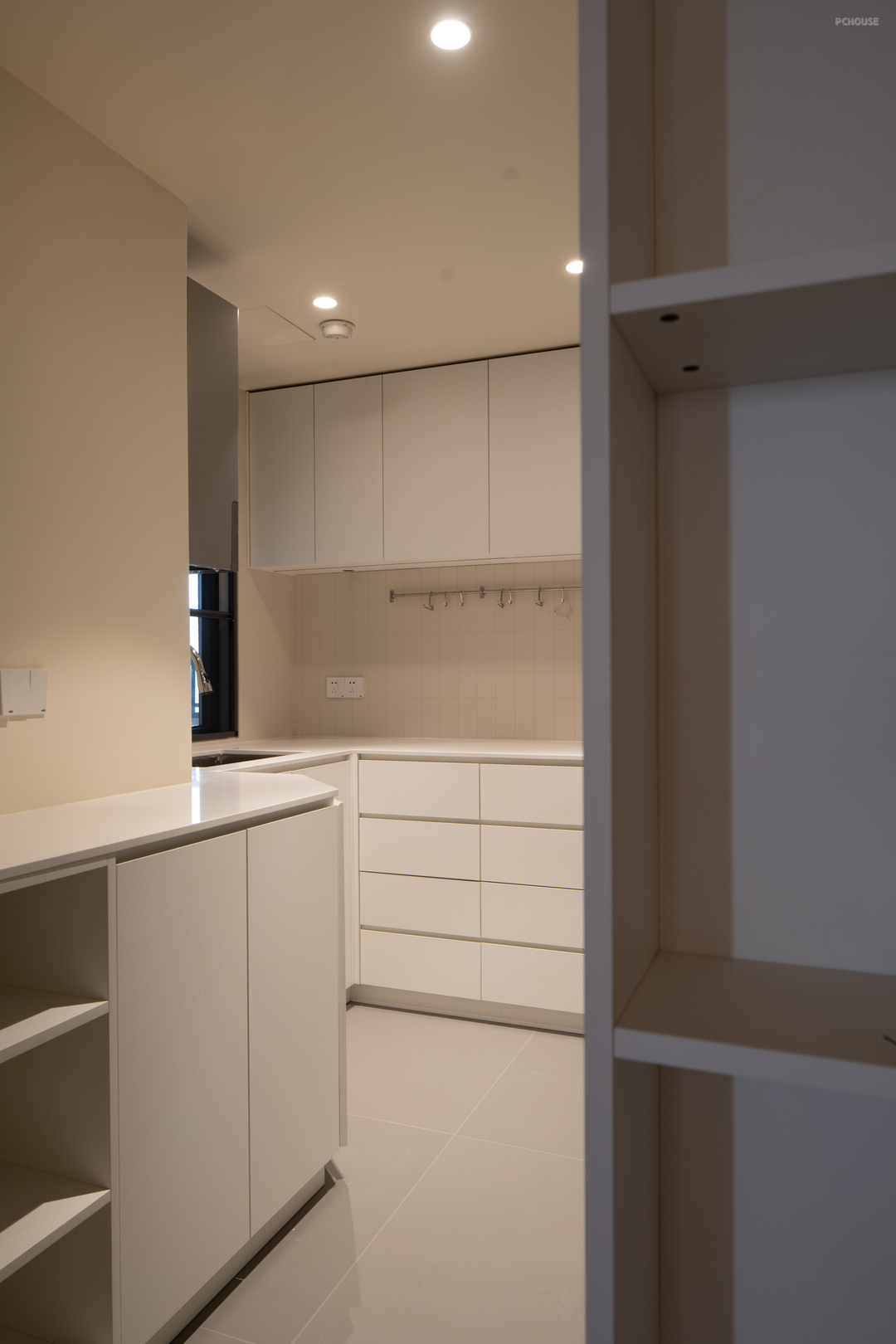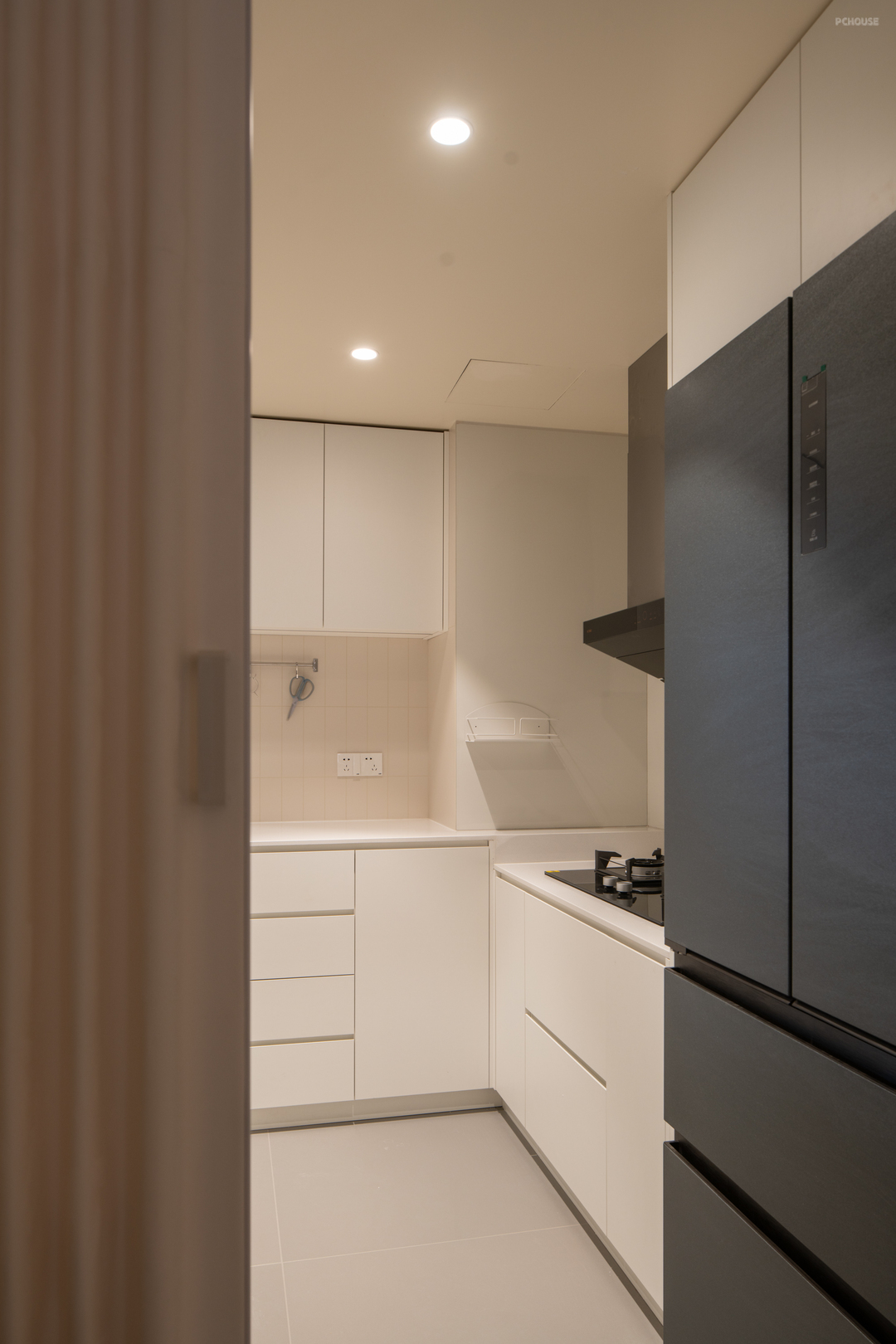 厨房采用了白/粉配色,与客餐厅的风格一致。异形橱柜将厨房的使用空间“压榨”到极致,从左到右分别为「传菜区→水槽区→备菜和小家电区→炒菜区→冰箱区」。