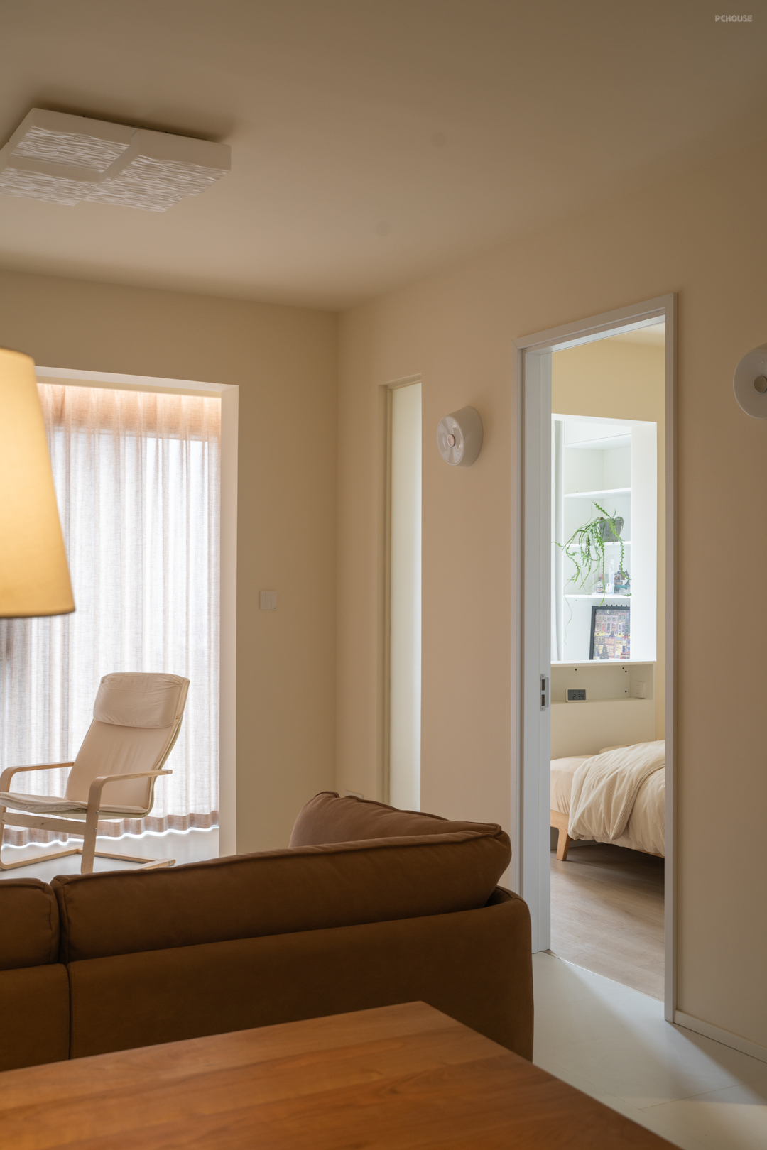 次卧与客厅之间开了两扇采光窗,其中一扇便开在客厅,强化了次卧与客厅之间隔而不断的心理感受。