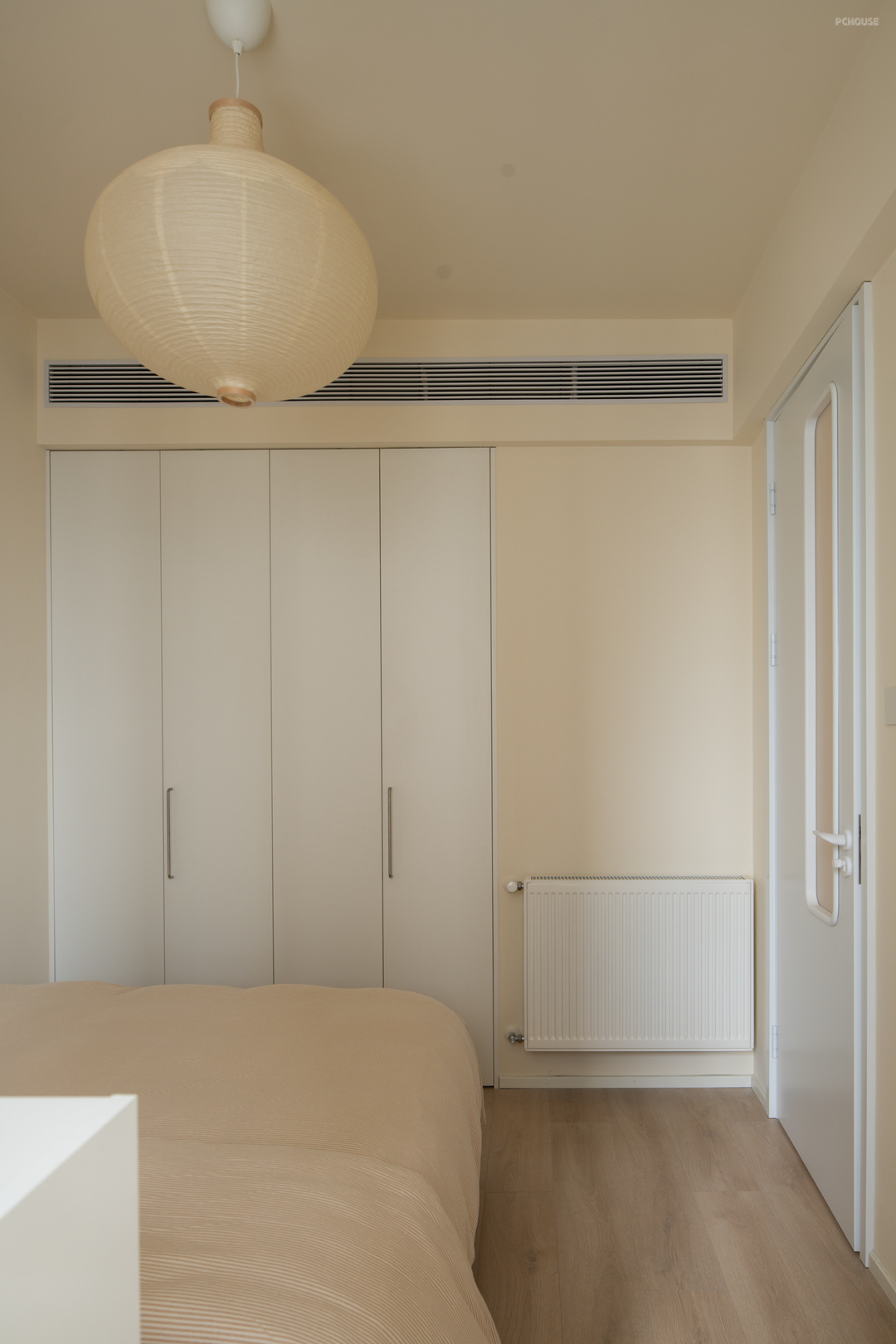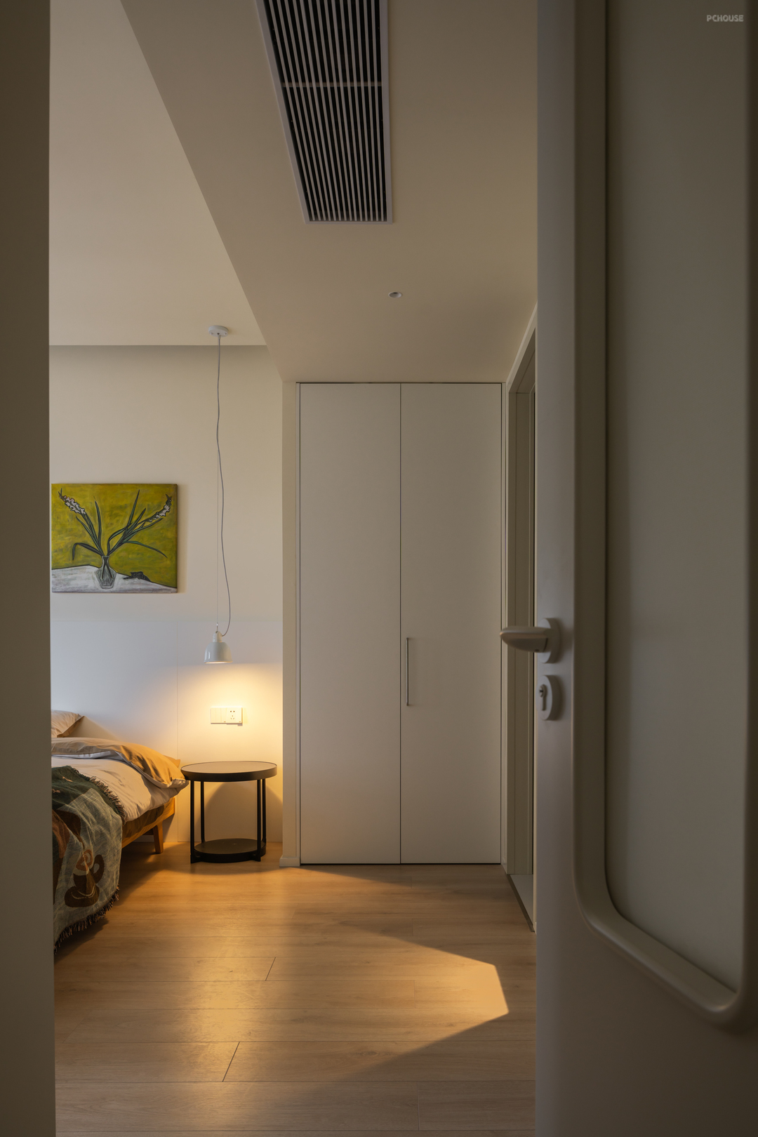 衣柜的另一侧,则是睡眠区。定制的护墙板一体延伸至整个墙面,提升视觉上的整体感的同时,也避免了墙体的磕碰。主卧的照明隐藏在吊顶内,大量的间接照明,避免了睡觉前遭受强光的刺激。