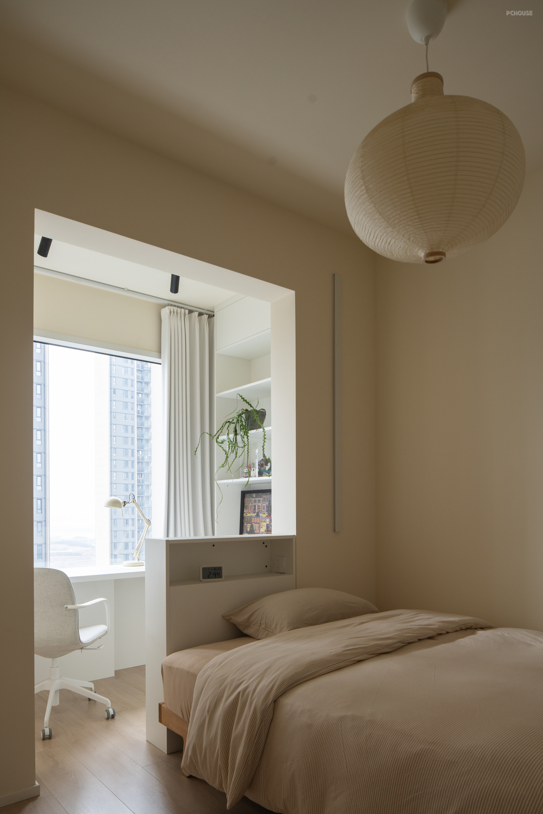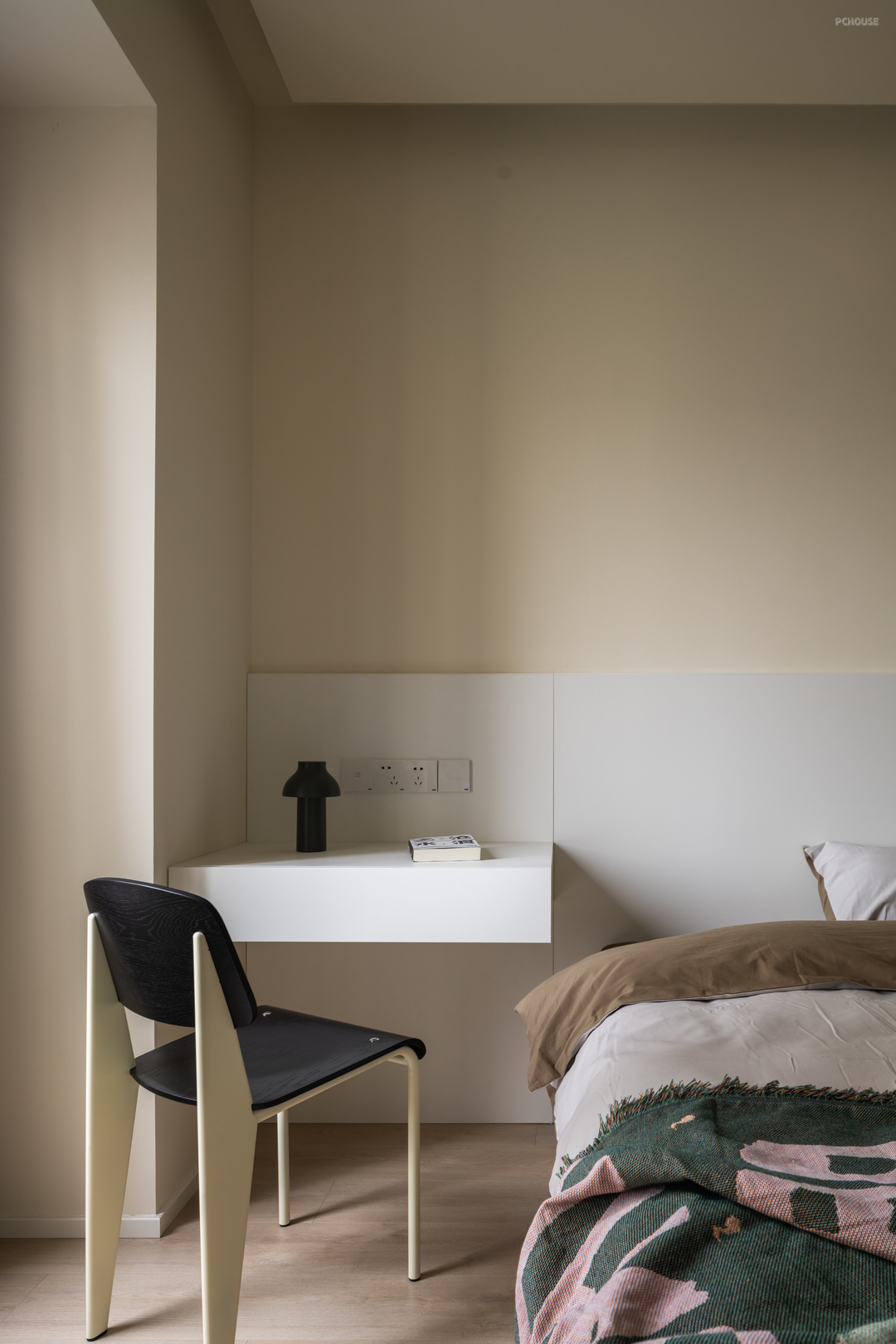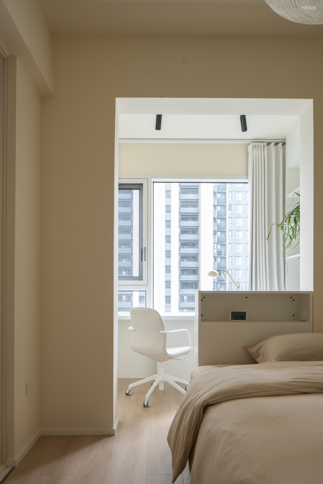 原本的次卧仅有8.3平米,仅够放下一张1.5米的床和衣柜。将阳台包进来之后,阳台就成了工作区,两个区域之间以一个定制床头柜作为隔断。