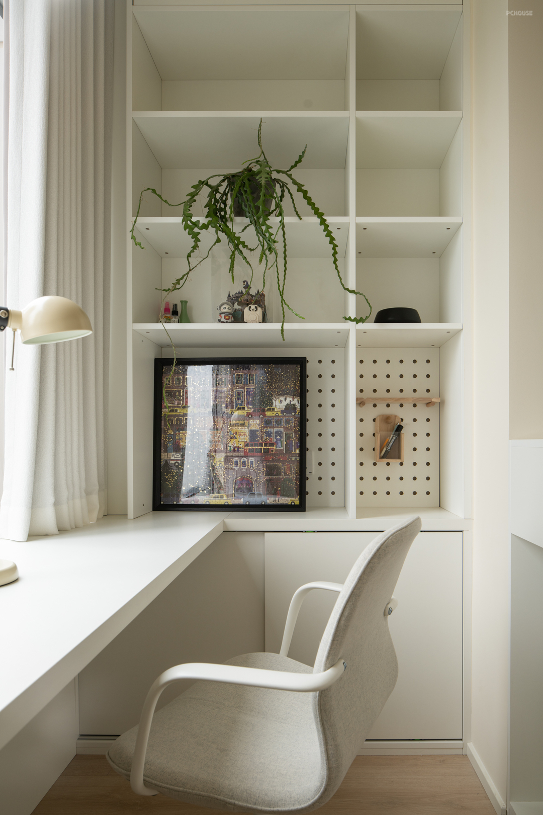 L型工作区由悬浮书桌与书柜组成。三种柜子形态:封闭柜、洞洞板、开放柜——满足了屋主多元化的使用需求。屋主平时有拼拼图的爱好,完成的大幅作品还可以放置在床头柜下部的开放格中。
