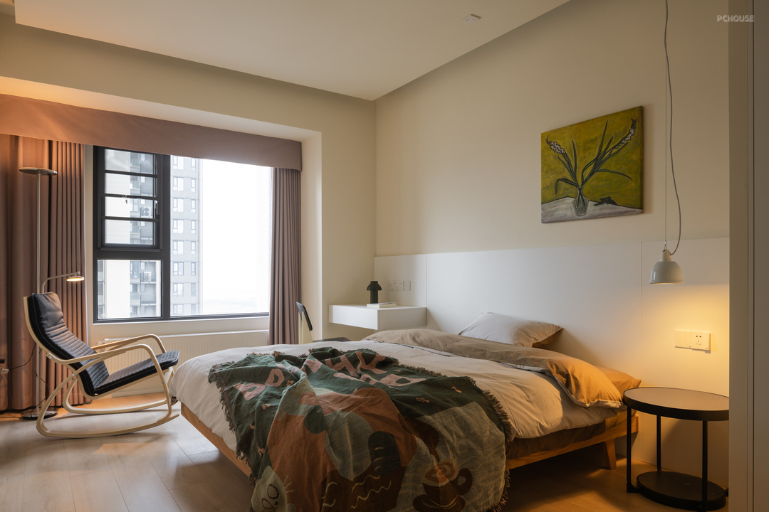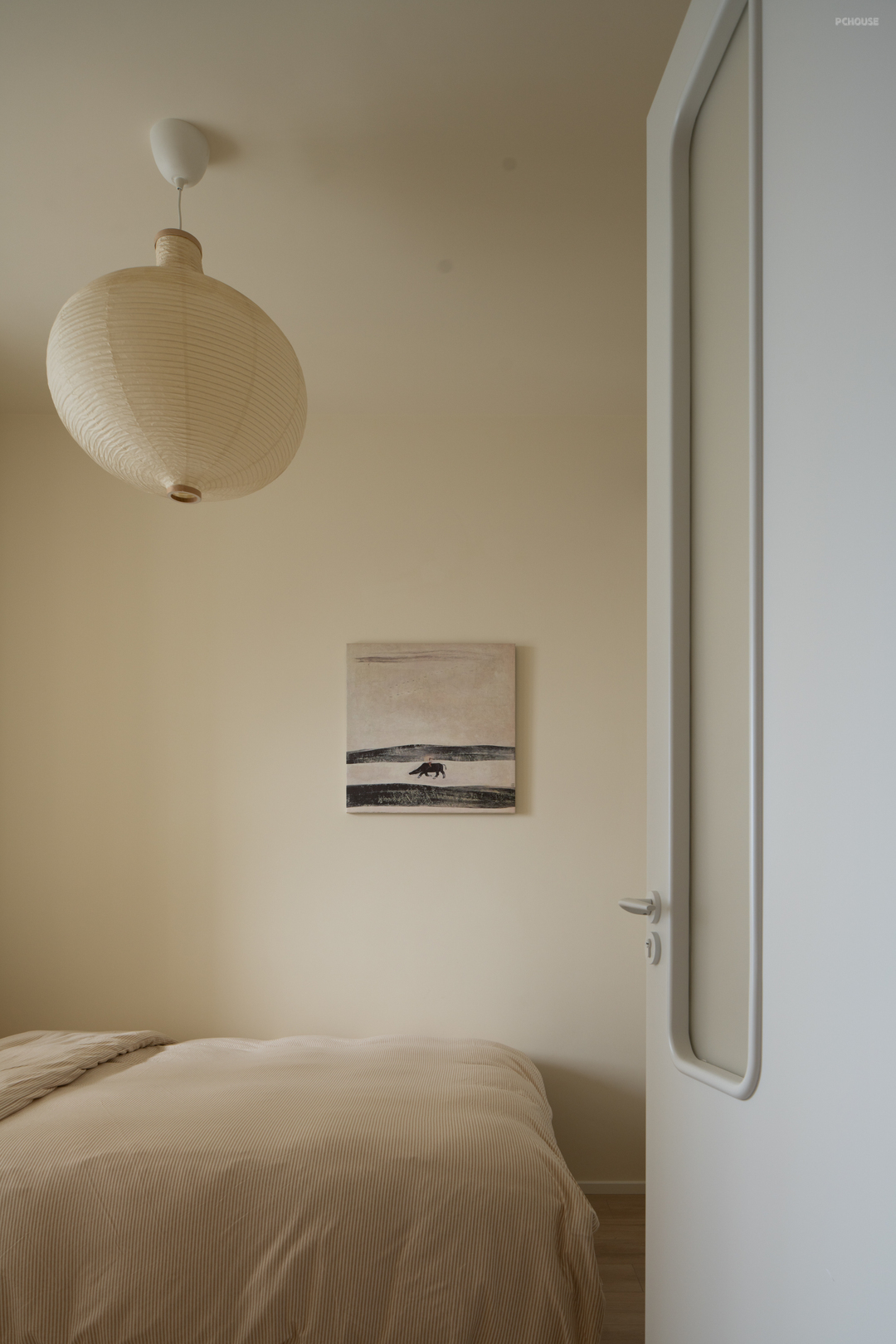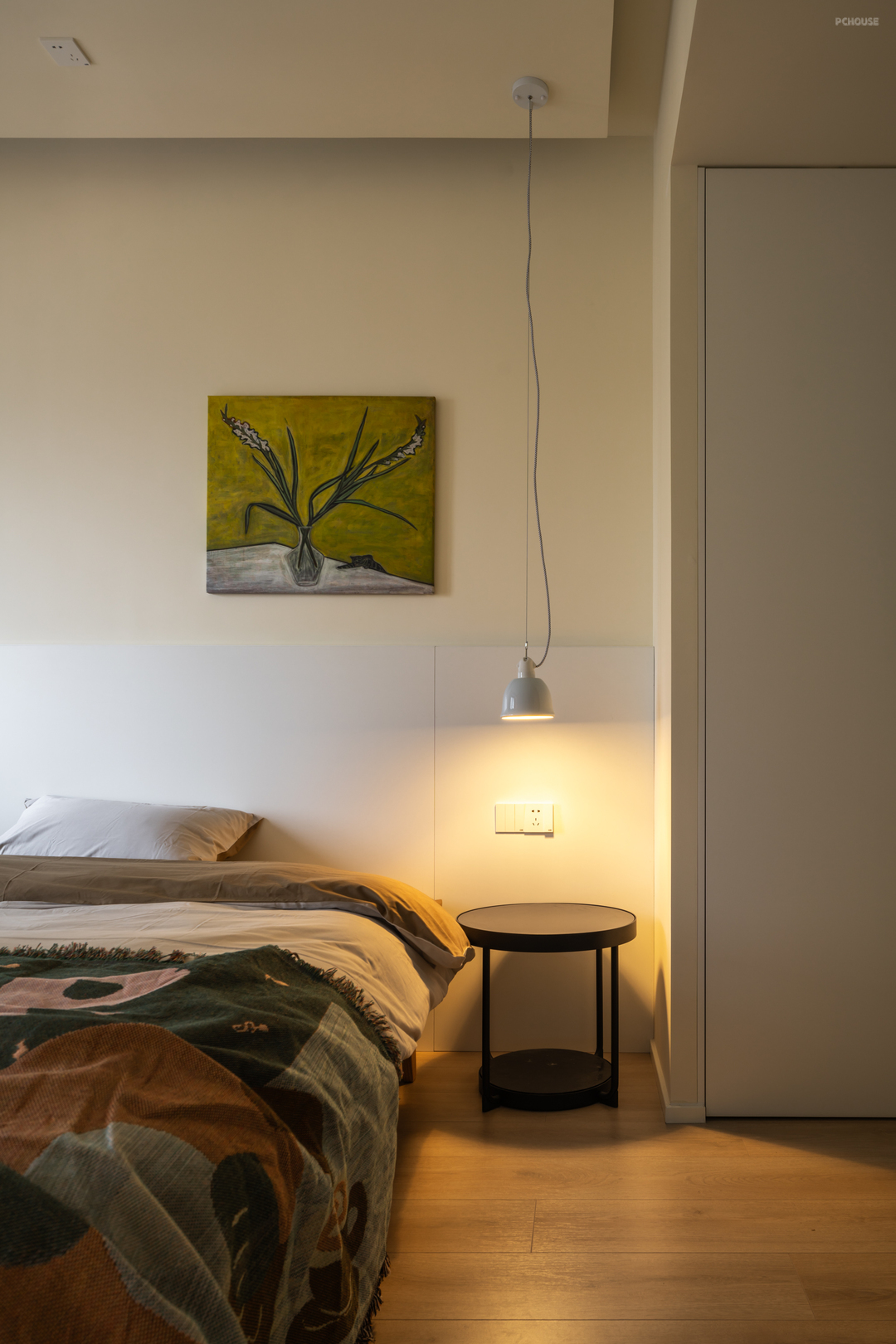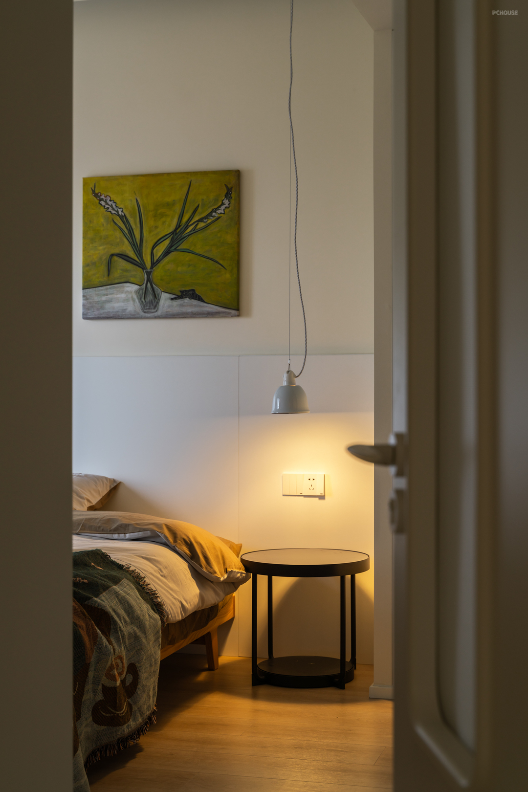 床头另一侧,白色搪瓷小吊灯散发着暖黄色的光源,这是每晚家里最后熄灭的那一盏灯,陪伴着屋主一晚好眠。