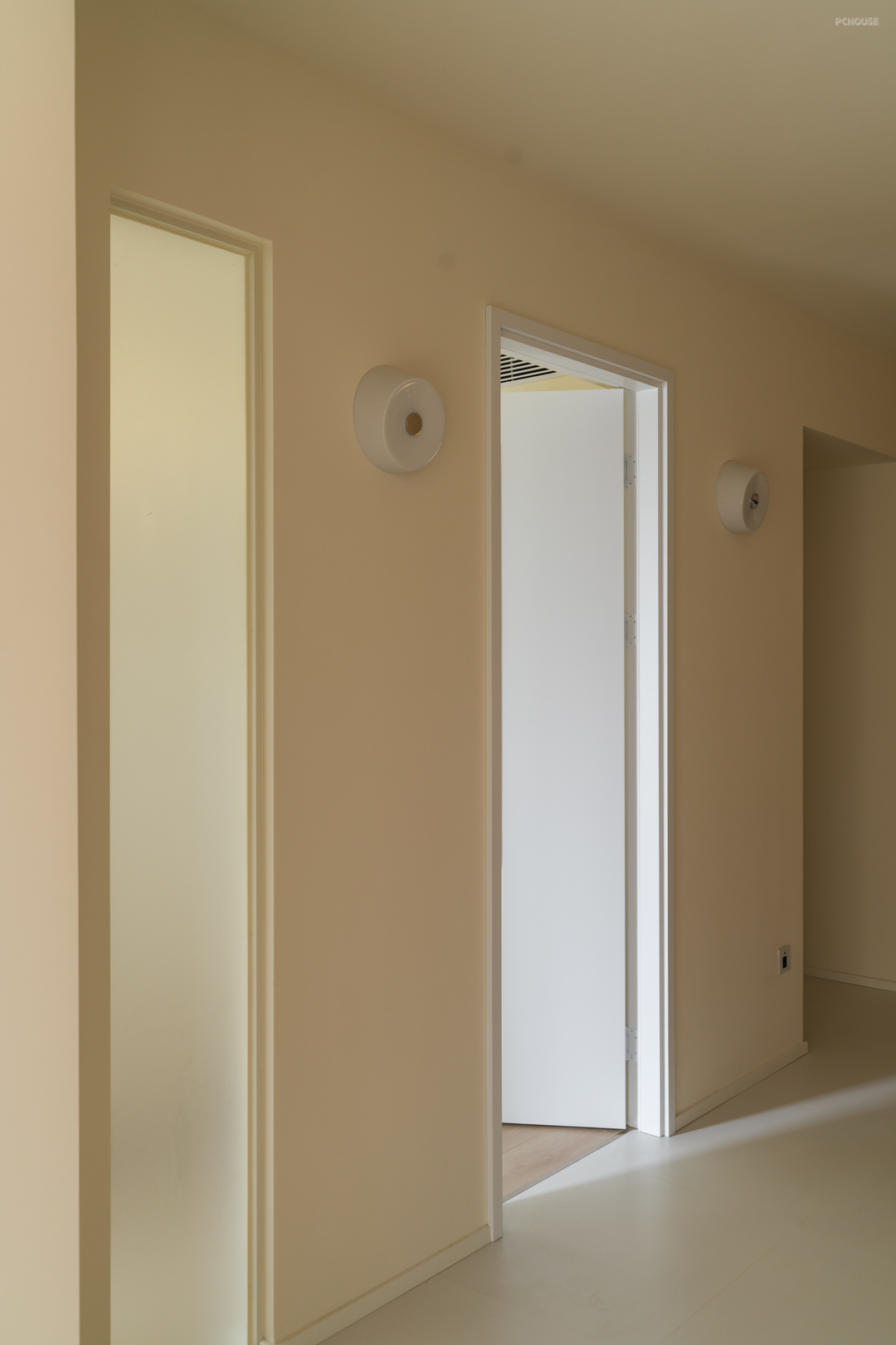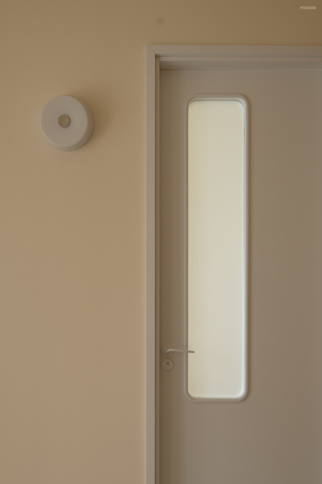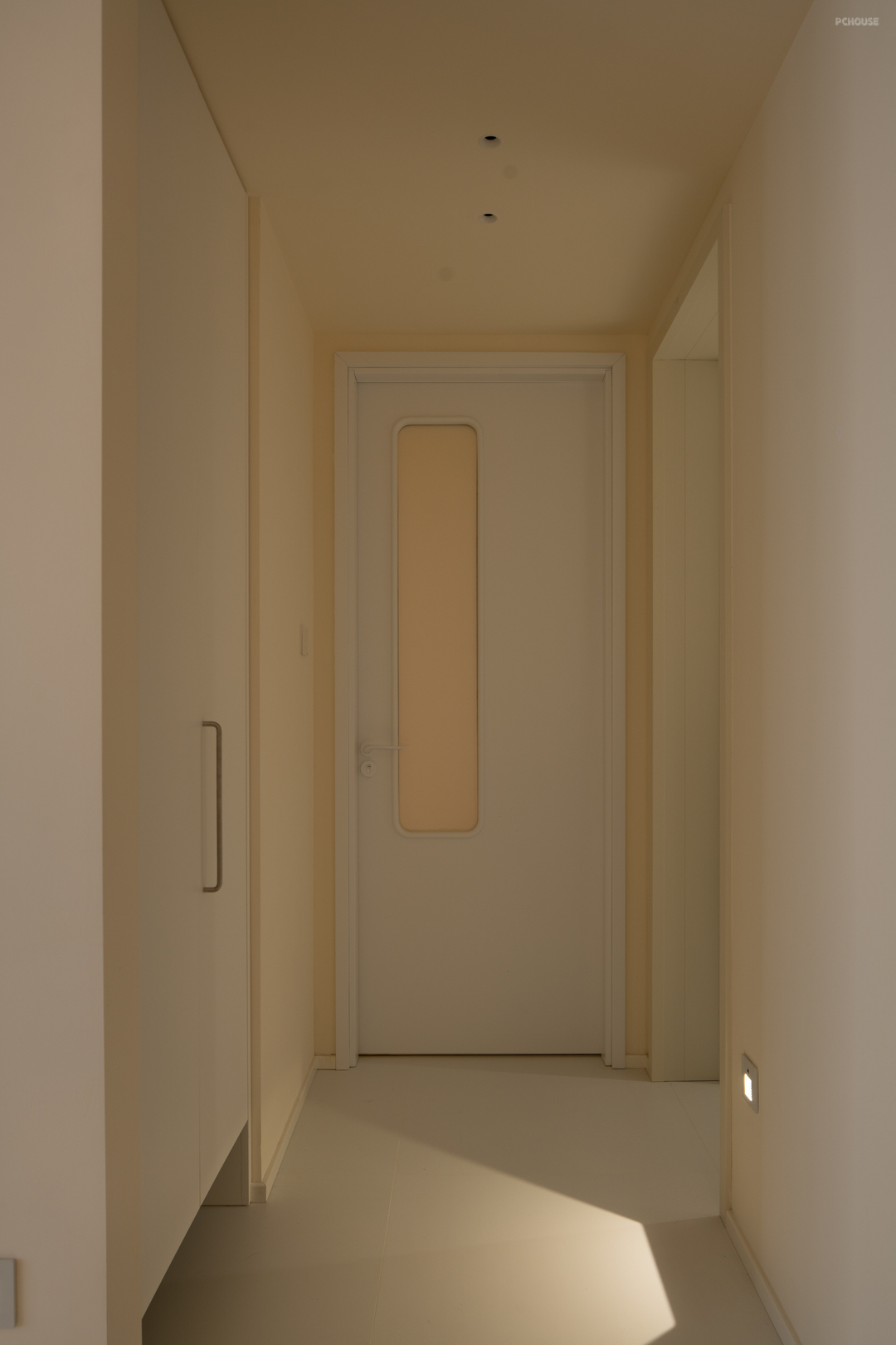 定制的门扇,嵌入了带有圆弧的长条玻璃,圆润的弧度与壁灯形成呼应,再次确认这个家的柔软。