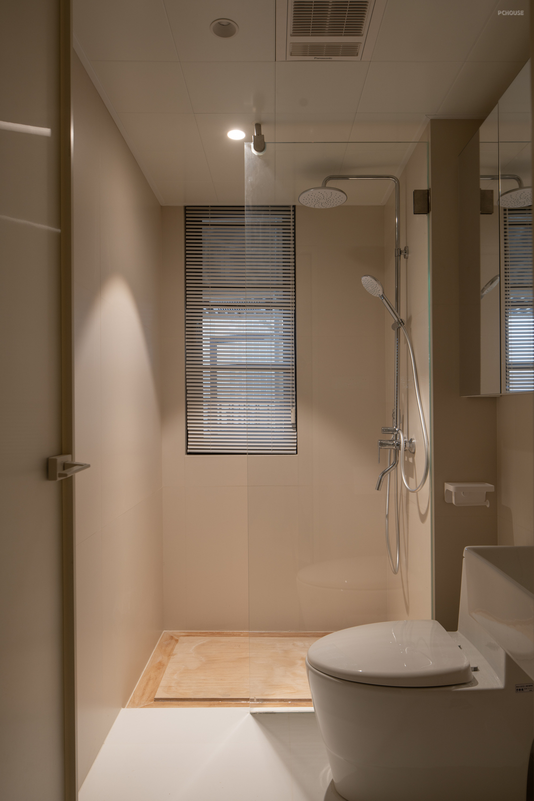 主卫是屋主的私人空间,更讲究舒适度和个人需求。因此安装了智能马桶和化妆灯。马桶上方的宜家汉尼斯搁架的展示功能突出,屋主可以摆放杂志、香薰、摆件等等。