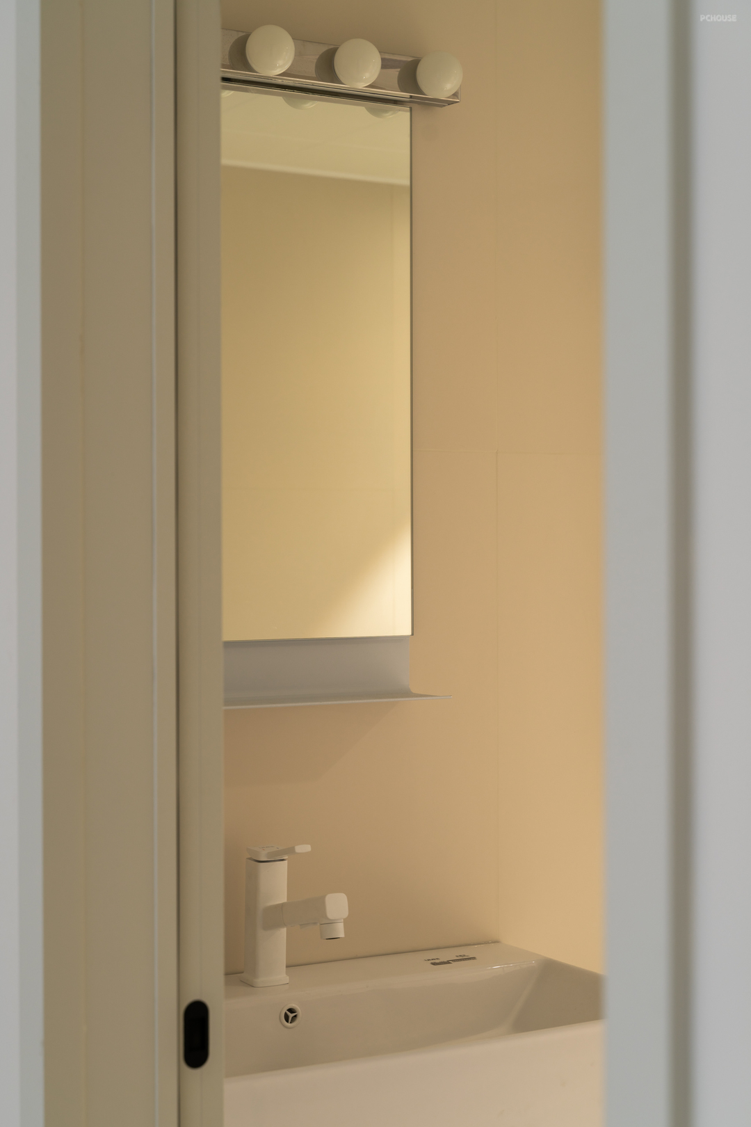 奶油色的瓷砖,搭配着白色的洁具,玻璃灯球反射着柔和的光线,给人以纯粹的温柔感。