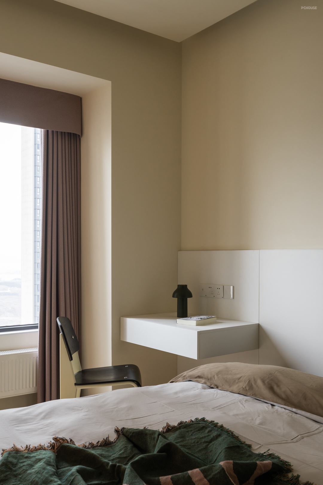 床头有一个定制小桌,同时也是睡前小搁板,可随手放些书本、杂物、手机。